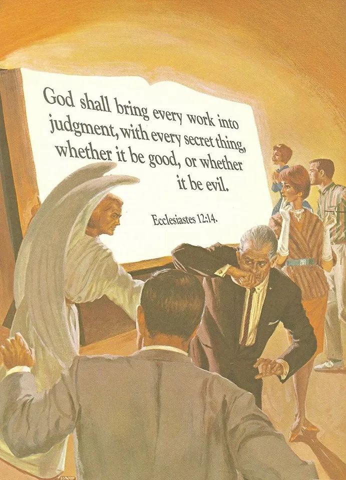 注:在这幅审判画面进行的时期,义人和恶人仍在坟墓里,不在现场。然而,每个人的生平记录却在天上的册子上,凭所录的就知道人的品德与行为了。基督在这里是作为那些接受他为救主之人的中保(约壹2:1)。他呈献上自己的血,恳求从册子上涂抹他们的罪。因为审判的地点在天上,上帝的宝座面前,基督又亲自在场,所以审判必也是在天上。每一个人都按着自己一生的行为记录受审,受报应。这审判的工作不仅永远决定了死人的案情,而且也向所有活着的人关闭了恩典的大门。审查的工作一结束,基督将随之驾云降临,把忠心的人接到自己那里去。