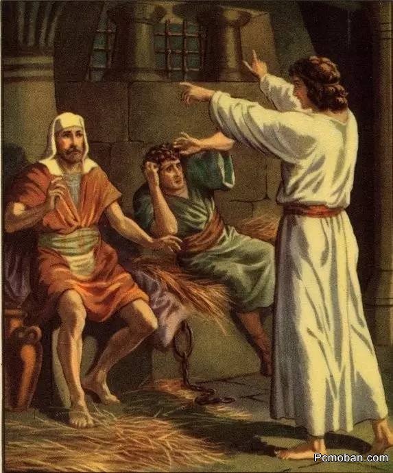 约瑟被关了,他说我实实在在的是从希伯来之地被拐来的,我在这里没有作过什么事情;那么耶稣呢,他也没有作过什么事情叫他被钉十字架,连彼拉多都说我找不到他有什么样的罪过。所以在这些地方我们看到了一一的对应。我们继续往下看。后来的事情,就正如约瑟所说的这两个犯人,一个官复原职,一个就被砍头。