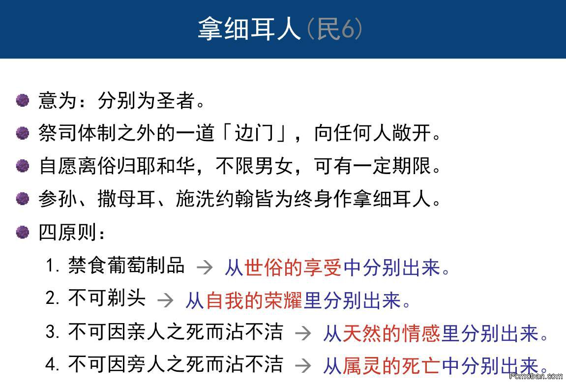 下面继续看第六章。这里说的是作拿细耳人的一些条例。民6:1-4 耶和华对摩西说:“你晓谕以色列人说:无论男女许了特别的愿,就是拿细耳人的愿(拿细耳就是归主的意思;下同),要离俗归耶和华。他就要远离清酒浓酒,也不可喝什么清酒浓酒做的醋;不可喝什么葡萄汁,也不可吃鲜葡萄和干葡萄。在一切离俗的日子,凡葡萄树上结的,自核至皮所做的物,都不可吃。”这是对作拿细耳人饮食上的一些特别要求。拿细耳人的愿是在一个特定的时间,把自己献给上帝。耶稣来到人间,他也是在这段时间里把自己自愿献给上帝的。约10:15 “正如父认识我,我也认识父一样;并且我为羊舍命。”耶稣为我们舍命,是自己舍去的,没有人取他的性命。自己舍去也有权柄取回来。来10:5-7 基督来到世上的时候就说:“上帝啊,祭物和礼物是你不愿意的;你曾给我预备了身体。燔祭和赎罪祭是你不喜欢的。那时我说:上帝啊,我来了,为要照你的旨意行;我的事在经卷上已经记载了。”