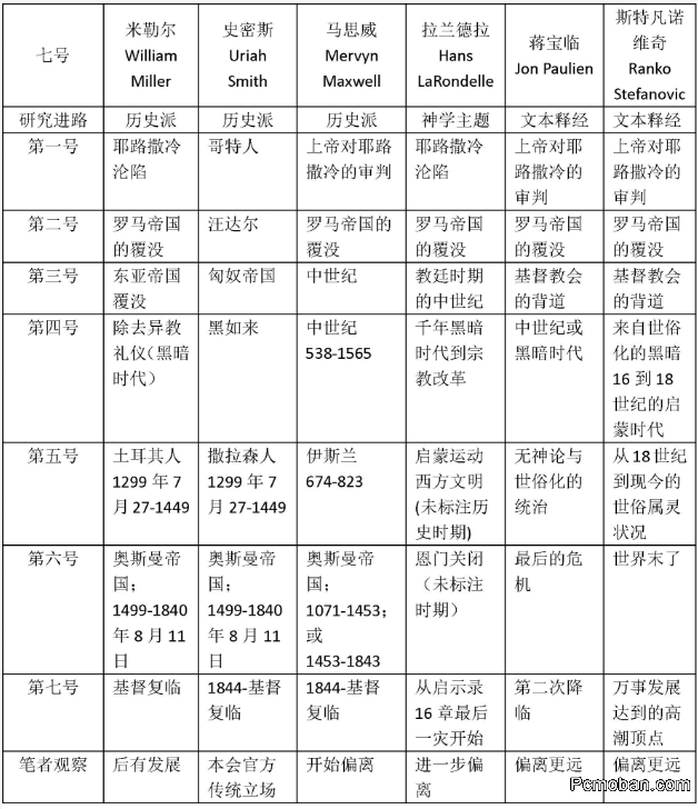 “与上面结论不同的缺口的浮现,始于二十世纪后半部分,体现在爱德文·蒂勒(Edwin Thiele)与马思威(C. MervynMaxwell)的著作中。罗马不再被视为第一号的对象,而变成了上帝惩罚耶路撒冷的手段。这种观点,导致两位学者对第三、第四号分别作为灵意化的解释。在安德烈大学执教十四年之久的威廉·夏(William Shea),在两篇未发表的论文中有类似的表现。而且,认为上帝不加分辨地处罚不同的对象,甚至在第一号中针对原始教会,本身就是一种不明智之举。七号是上帝对压制他子民的帝国所发出的惩罚吗?当然是!见耶51:27,35-36。上帝要毁灭的最后一个帝国是谁?难道不是由启示录中的巴比伦所代表的罗马吗?(比较启9:14;17-18)