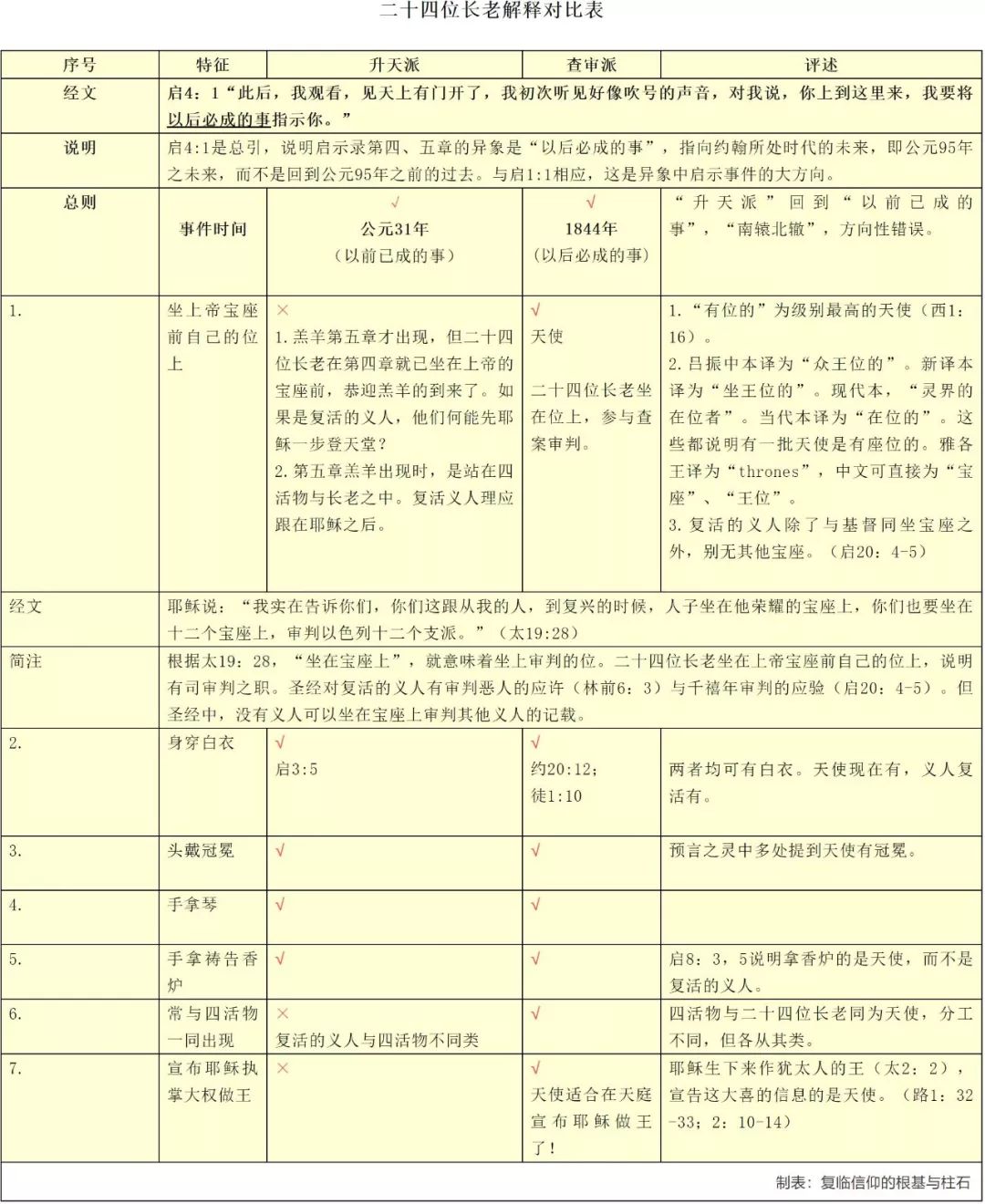 通过列表比较,可以看出,“复活升天派”的解释,有诸多漏洞与困难,与圣书的启示冲突较多。而“查案审判派”的理解,似与圣书经文更加吻合。