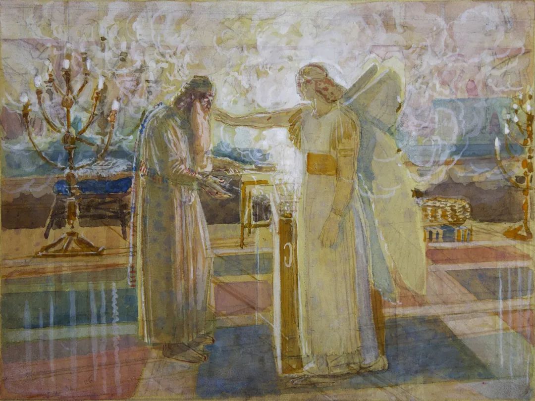 由此可见,撒迦利亚虽然年纪老迈,但他似乎还在为能得到一个儿子求告,表明他对上帝的信心。身上闪闪发光的天使在他面前出现,撒迦利亚看见自然有些惊慌。天使安慰他说:你不要害怕,你的祷告上帝听见了。你妻子要给你生一个儿子,给他起名叫约翰,他是有使命的。