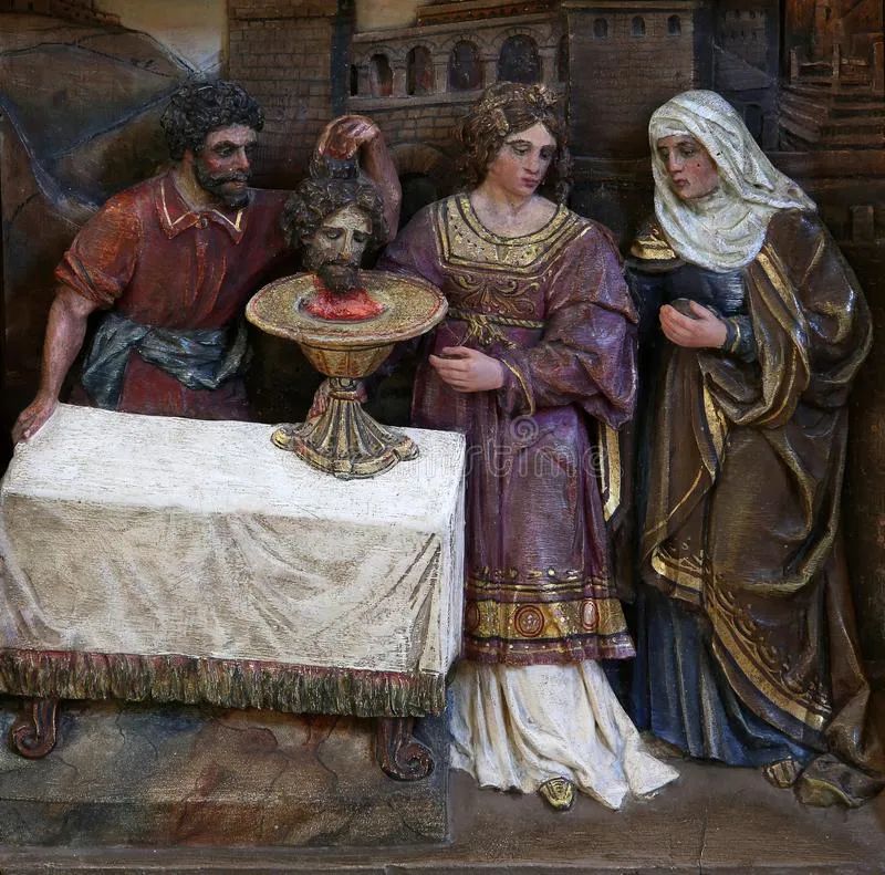 酒筵之间,希罗底设计叫女儿跳舞逗希律欢心,希律起誓:你求什么,就给什么。母亲早已教女儿,就要施洗约翰的头,放在盘子里给我。希律听后虽然非常地忧愁,但是既然已经在众人面前起了誓,不好更改,于是就吩咐卫兵把约翰的头取过来。(参可6:22-28)