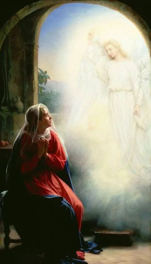 路1:26-38“(当施洗约翰还在母腹中)到了第六个月,天使加百列奉上帝的差遣,往加利利的一座城去,这城名叫拿撒勒。到一个童女那里,是已经许配大卫家的一个人,名叫约瑟,童女的名字叫马利亚。天使进去,对她说:'蒙大恩的女子,我问你安,主和你同在了!'马利亚因这话就很惊慌,又反复思想这样问安是什么意思。天使对她说:'马利亚,不要怕!你在上帝面前已经蒙恩了。你要怀孕生子,可以给他起名叫耶稣。他要为大,称为至高者的儿子,主上帝要把他祖大卫的位给他。他要作雅各家的王,直到永远,他的国也没有穷尽。'(天使向她表明应许,马利亚非常的惊慌、非常吃惊。)马利亚对天使说:'我没有出嫁,怎么有这事呢?'天使回答说:'圣灵要临到你身上,至高者的能力要荫庇你,因此所要生的圣者,必称为上帝的儿子(或作“所要生的必称为圣,称为上帝的儿子”)。况且你的亲戚伊利莎白,在年老的时候也怀了男胎,就是那素来称为不生育的,现在有孕六个月了。因为出于上帝的话,没有一句不带能力的。'马利亚说:'我是主的使女,情愿照你的话成就在我身上。'天使就离开她去了。”