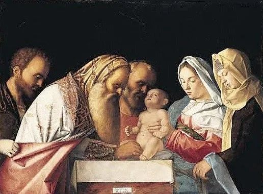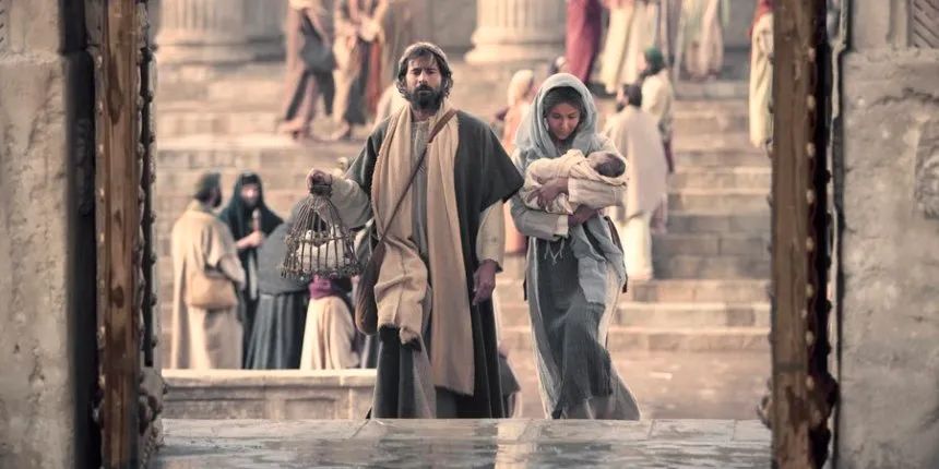 耶稣的父母带他到圣殿。在《以西结书》里看到,上帝的荣光已经离开以色列了,古时停在施恩座上的荣光,已经离开了圣所。但《哈该书》曾经说,这殿将来“万国所羡慕的必来到,我就使这殿满了荣耀。(该2:7)”“这殿后来的荣耀必大过先前的荣耀。在这地方我必赐平安。这是万军之耶和华说的。(该2:9)”就是指耶稣这个时候要进入圣殿。
