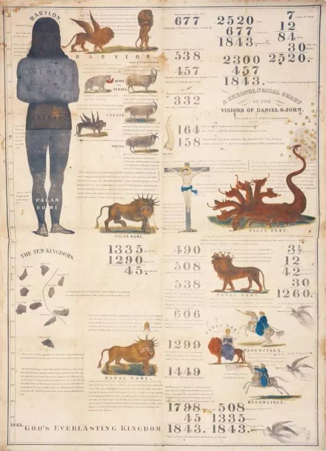 看明白了吗?原文只有一个“七”字,但是上帝是要按照“七倍”的程度来惩罚呢?还是按“七期”的时间长度来惩罚?米勒尔研究后就认为,这个“七”更为合理的解释是代表“七年”,这是他的理解。所以在“1843预言图表”的左上角可以看到这样一个等式,7×12×30= 2520,分散的时间2520年就是这么来的。