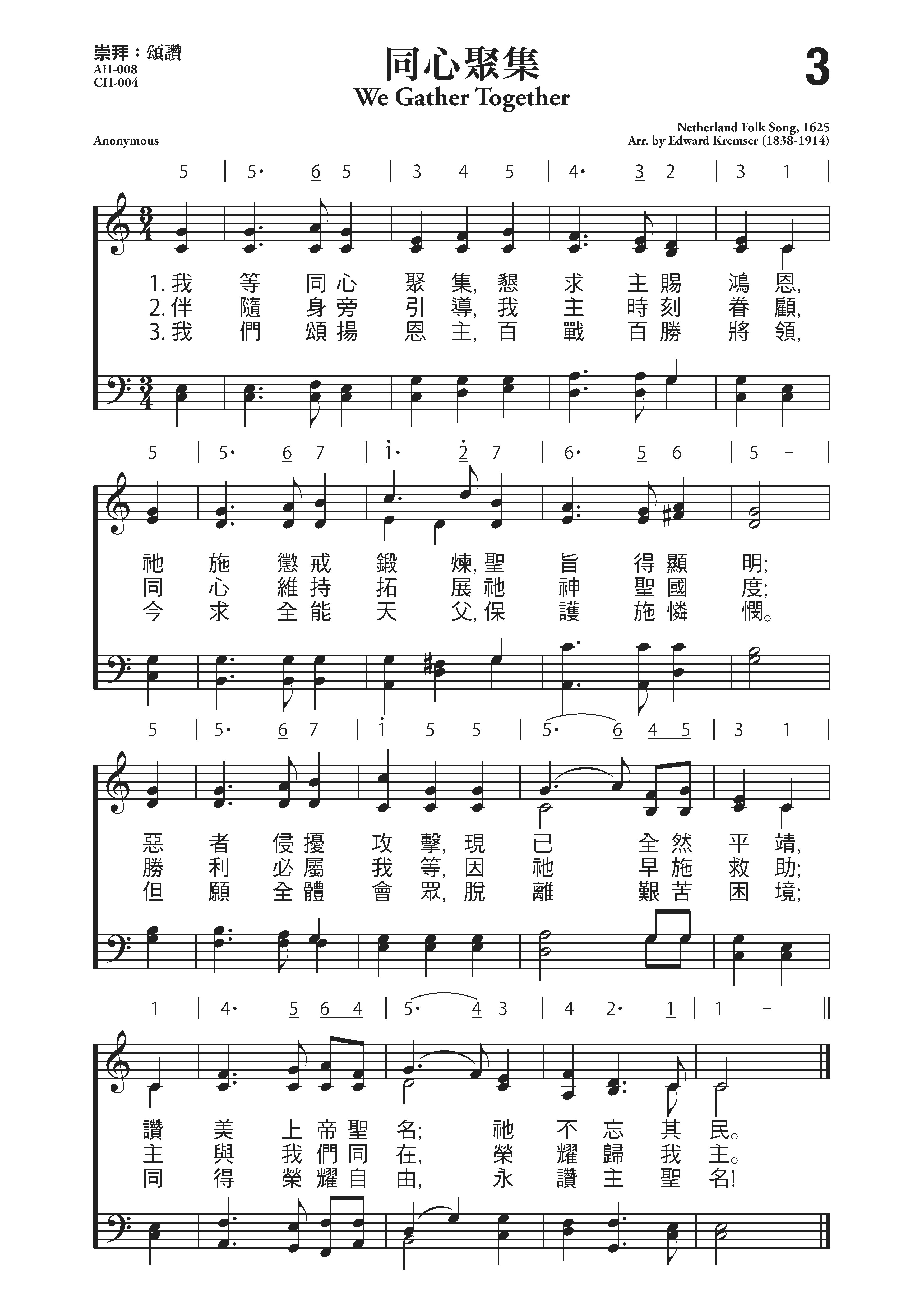 在荷兰人民反抗西班牙压迫的长期斗争中,曾涌现许多爱国歌曲。一位名叫瓦勒留发的音乐家编辑了一本诗歌集,于1626年出版,其中最著名的就是这首《同心聚集》,内容是庆祝摆脱外国压迫而感谢上帝。二百年后,克里米尔发现了这个诗集,就请维也纳著名的犹太籍词作家韦尔(Edward Weyl)翻译了其中的六首,由他自己进行改编,所以曲调名就叫《克里米尔》。这首诗歌格式简单,节奏鲜明,感情丰富,旋律多变,如波浪起伏。虽然是三拍子,但有进行曲的风格,最初是在欢庆的节期里由会众合唱,后来也经常用在教会的崇拜仪式上。