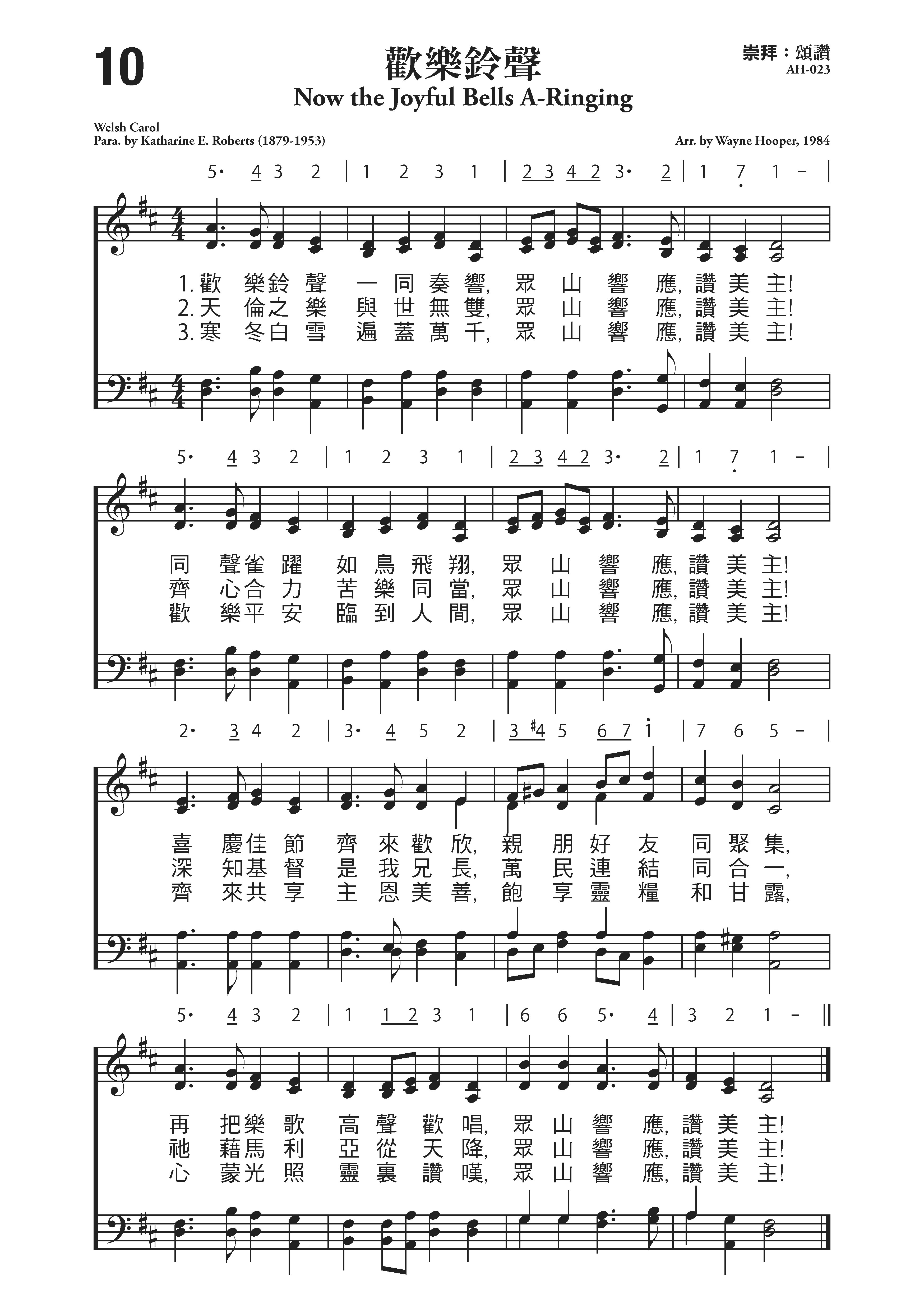 威尔士圣诞歌曲,凯瑟琳.E.罗伯茨(Katharine.E.Roberts,1879-1953)作词,韦恩. 胡珀(Wayne Hillard Hooper,1902.7.4-2007.2.27)曲谱改编