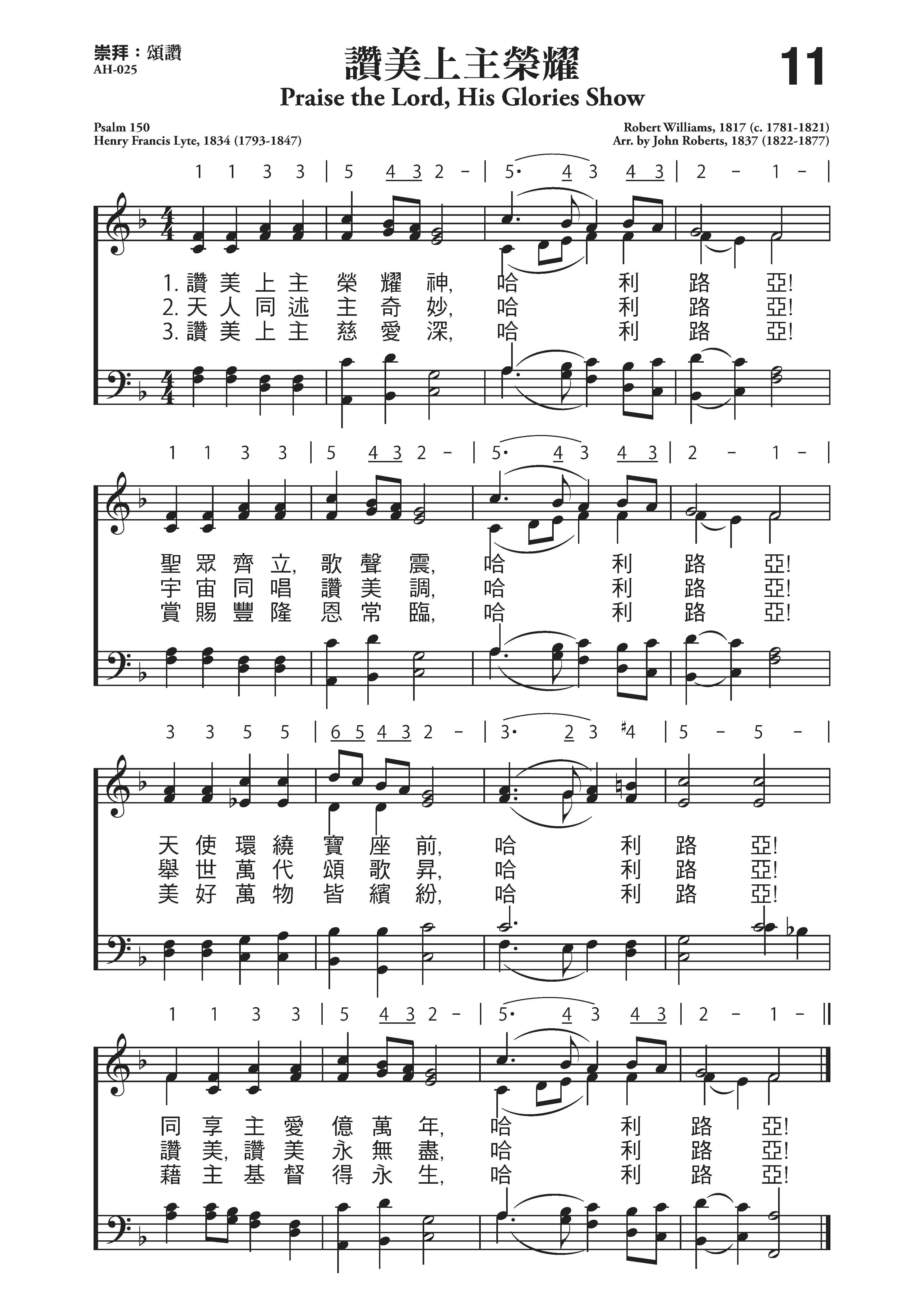 曲作者是英国威尔士盲人音乐家罗伯特.威廉斯。在每句之后都唱一遍“哈利路亚”,既合乎伪尔士信徒的传统,更烘托了歌唱时的气氛。《赞美诗》107首《主在高天掌权》也是用这个旋律。威廉斯生下来就双目失明,终生以编筐制篮为业。他具有优美的音色,灵敏的听觉,超强的记忆,所谱的圣诗曲调,富有威尔士的民族特色。