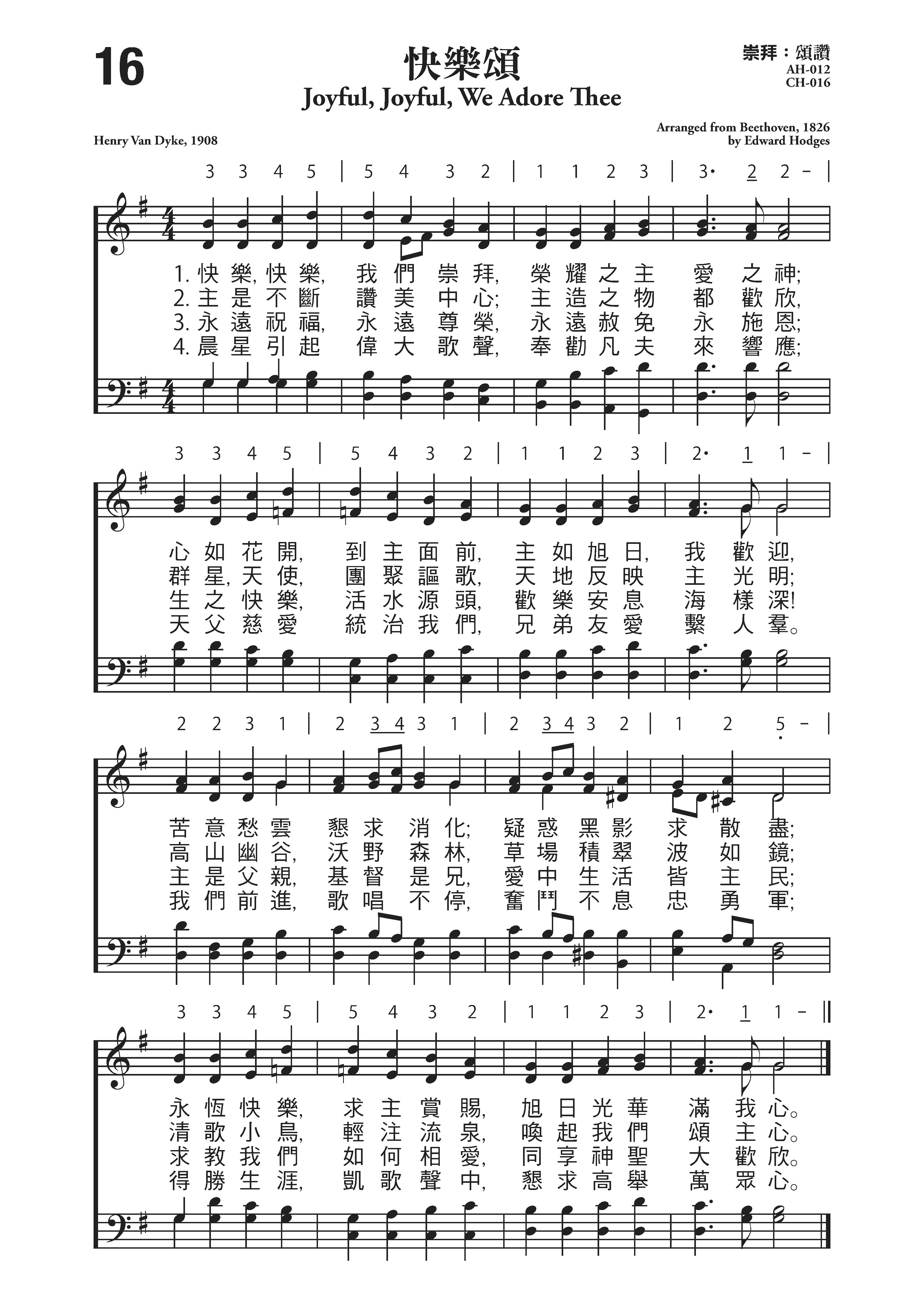 范.戴克(Henry Van Dyke,1852-1933)作词(1908年),贝多芬(Ludwig van Beethoven,1770,12,16-1827,3,26)作曲(1823年),霍奇斯(E.Hodges《1796,7,20—1867,9,1)改编。刘廷芳翻译(1934年)。