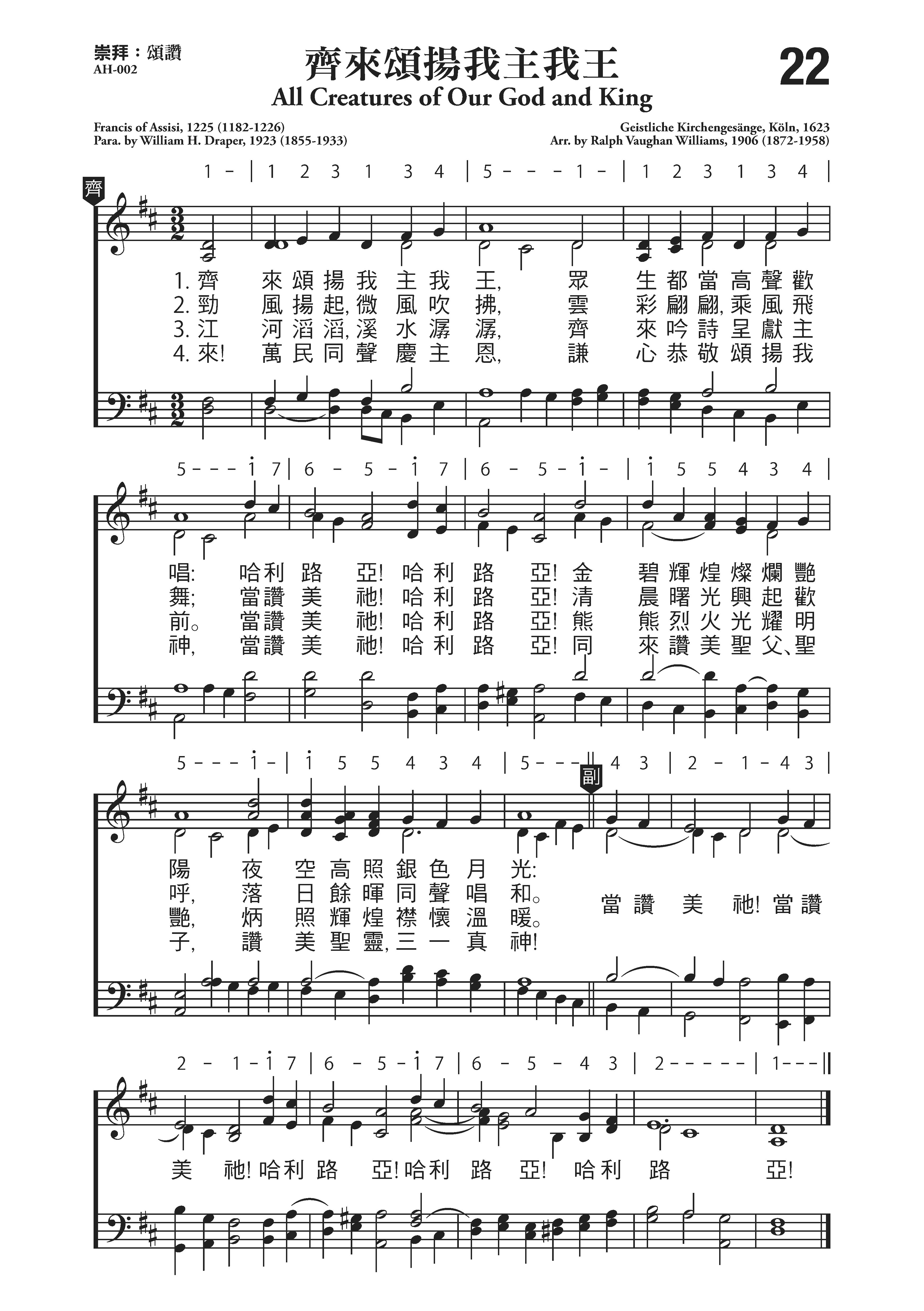 阿西西的弗朗西斯(Francis of Assisi,1182-1226,又译为圣方济 )作词(1182年),威廉.H.德雷珀(William H.Draper,1855.12.19-1933.8.9)改编(1923年) 曲调系德国民歌,由威廉斯(Ralph Vaughan Williams,1872,10,12-1958,8,26)配和声(1906年)