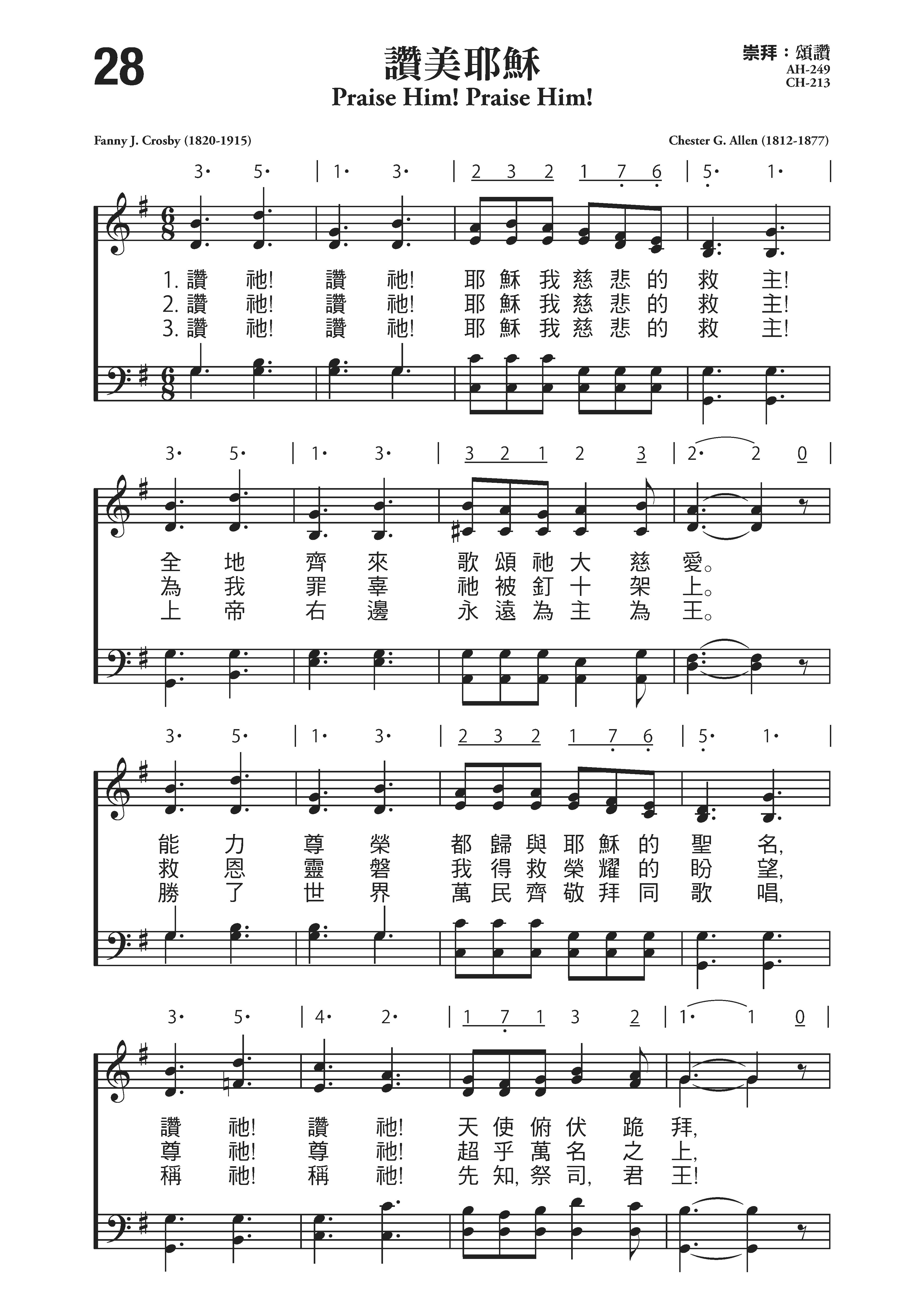 曲作者艾伦是美国音乐家,在俄亥俄州克里夫兰的公立学校担任过教师,曾与布雷德伯里和多恩等人合编过赞美诗集,其中有许多是他自己创作的。这首充满激情,旋律感人的曲调最初发表于供主日学所用的歌集《明珠》上,调名为《快乐之歌》,一直沿用之今。
