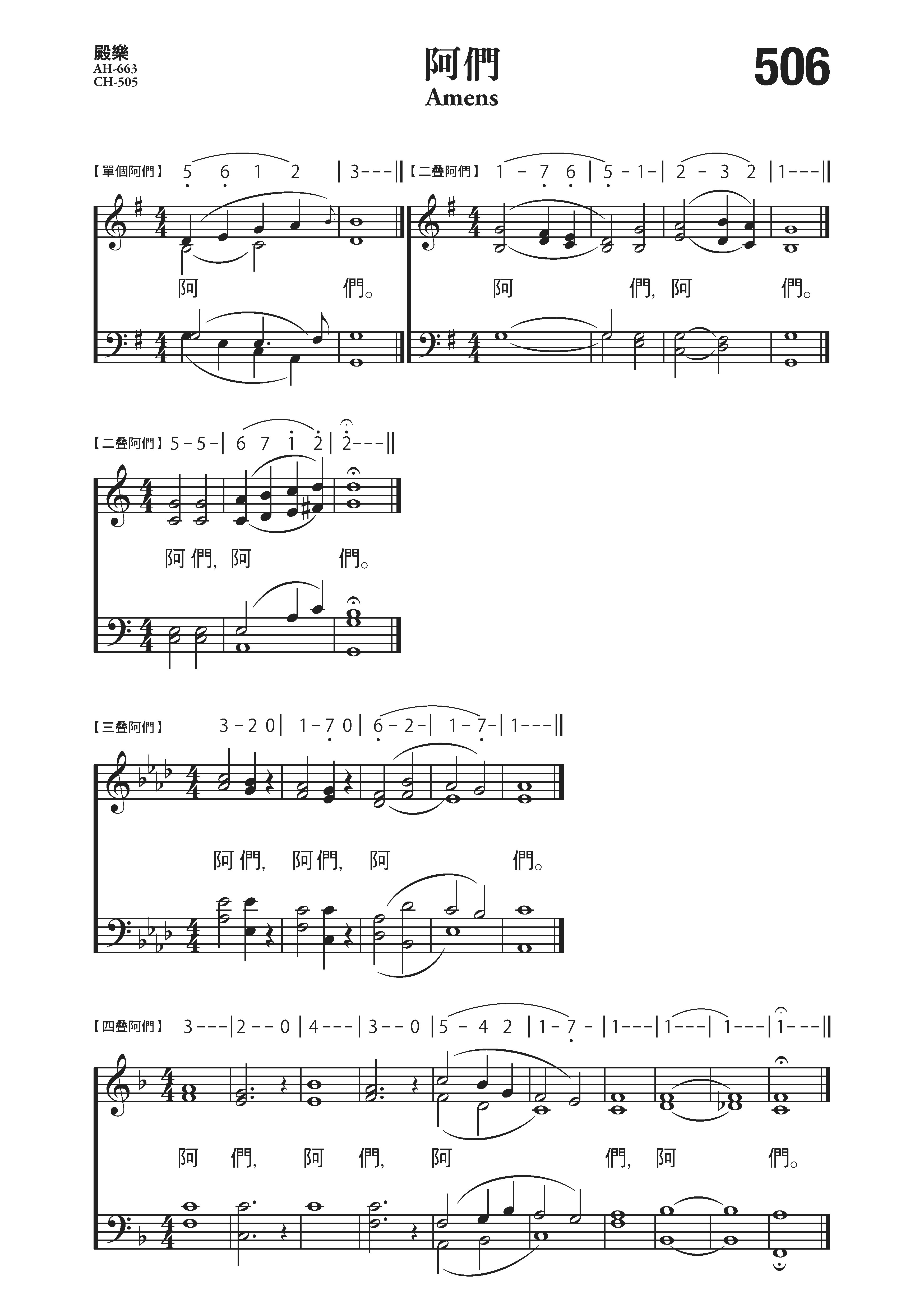 教会历史中流传下来的《阿门颂》很多。这里选了单个,二叠,三叠和四叠《阿门颂》。