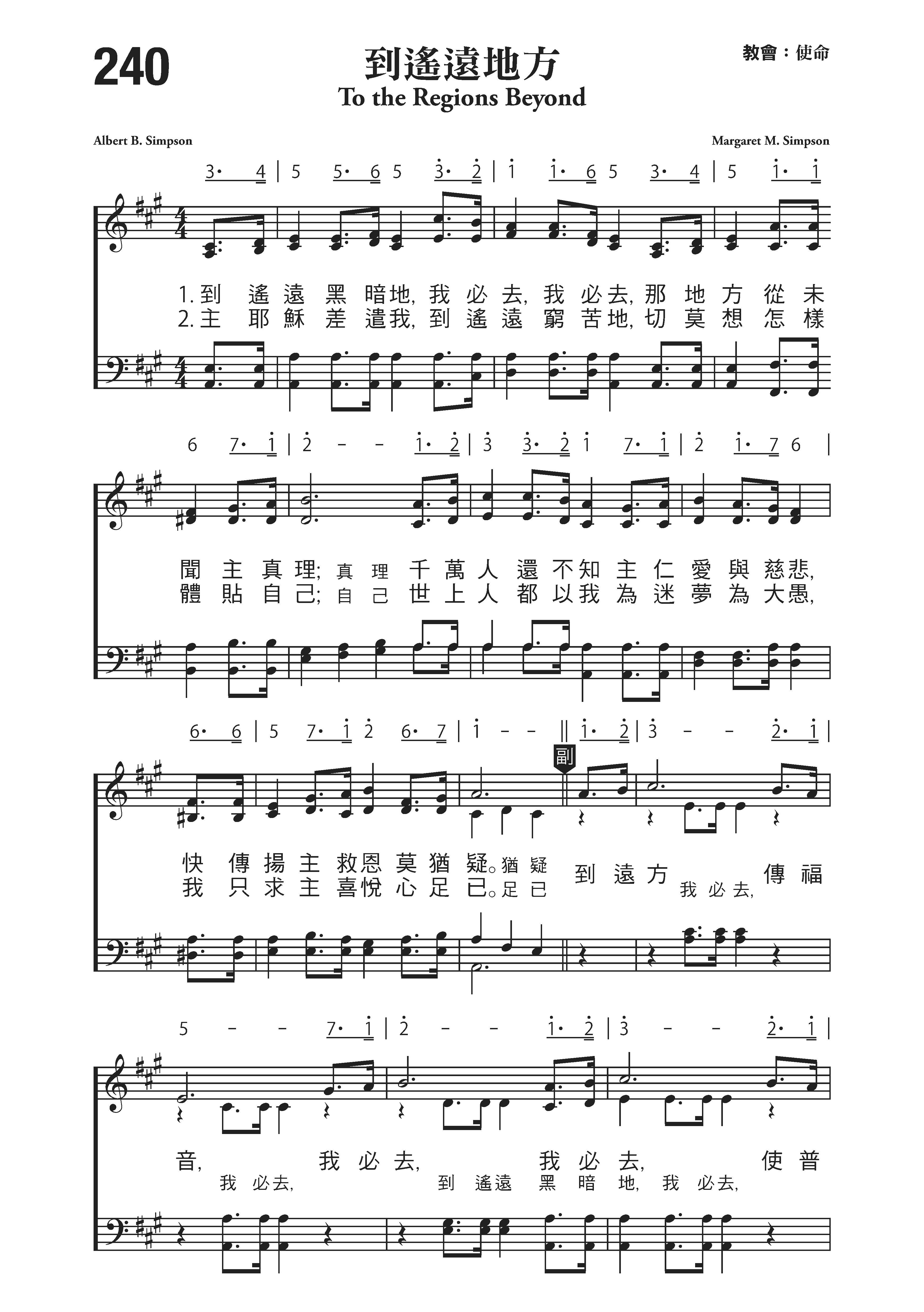 艾伯特.辛普森(Albert B.Simpson,1843-1919)作词;玛格丽特.辛普森(Margaret M.Simpson,1878.4-1958.10.9)