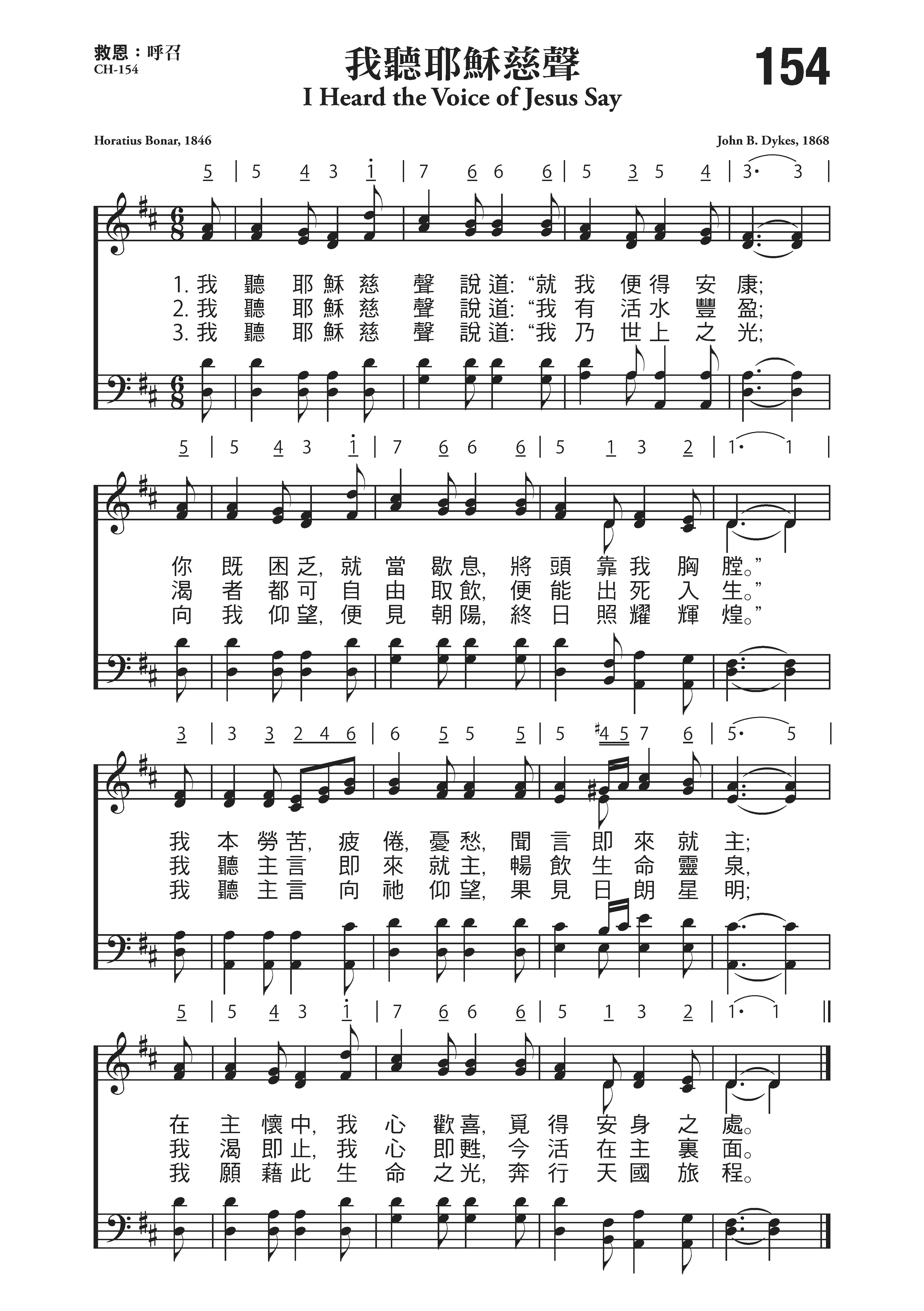 博纳(见《赞美诗》第124首介绍)作词(1846年); 戴克斯(见《赞美诗》第1首介绍)作曲(153首,1868年)