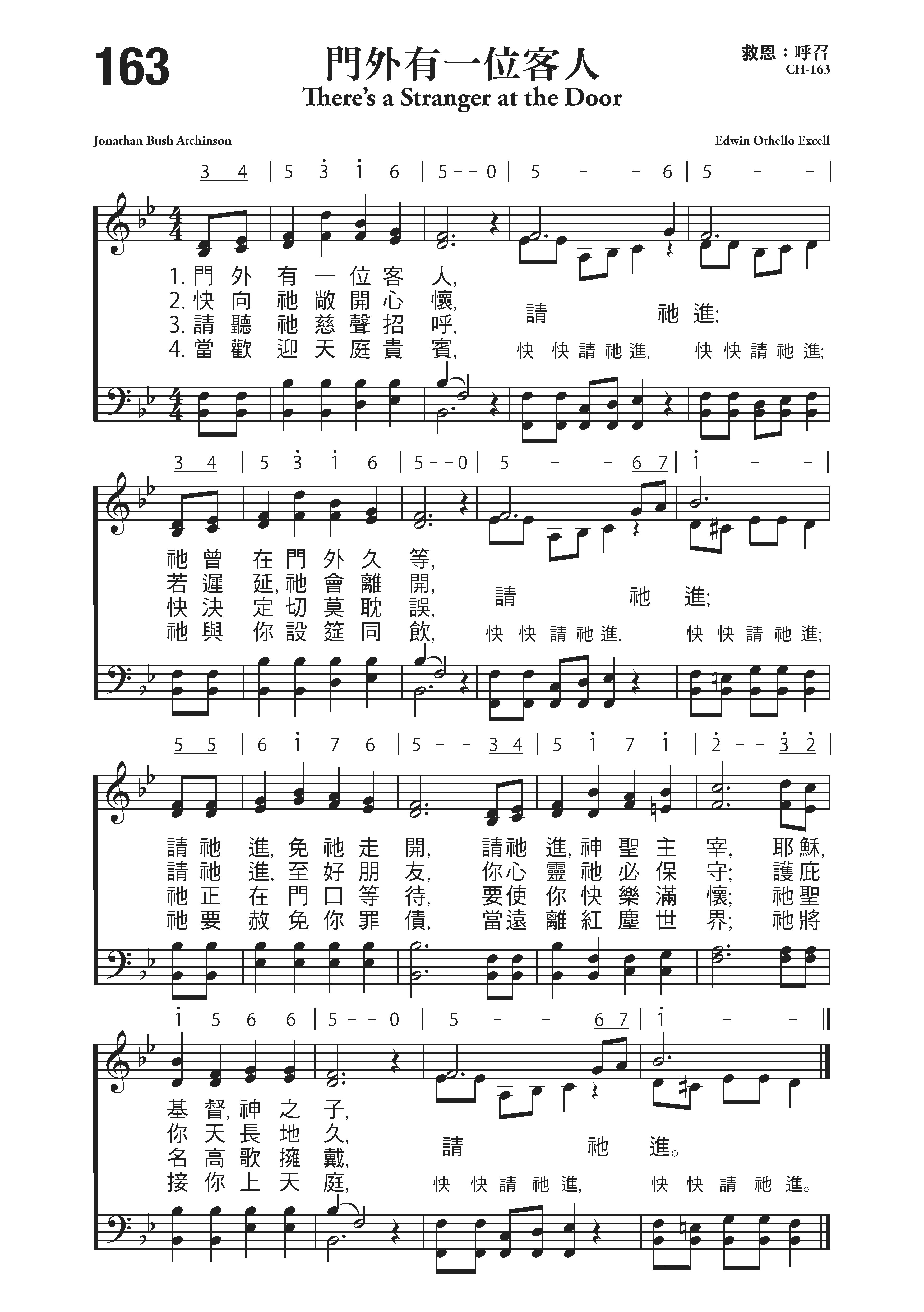 艾奇逊(J.B.Atchinson,1840,2,17-1882,7,15)作词,埃克塞尔(E.O.Excell, 1851,12,13-1921,6,10,见第261首介绍)作曲