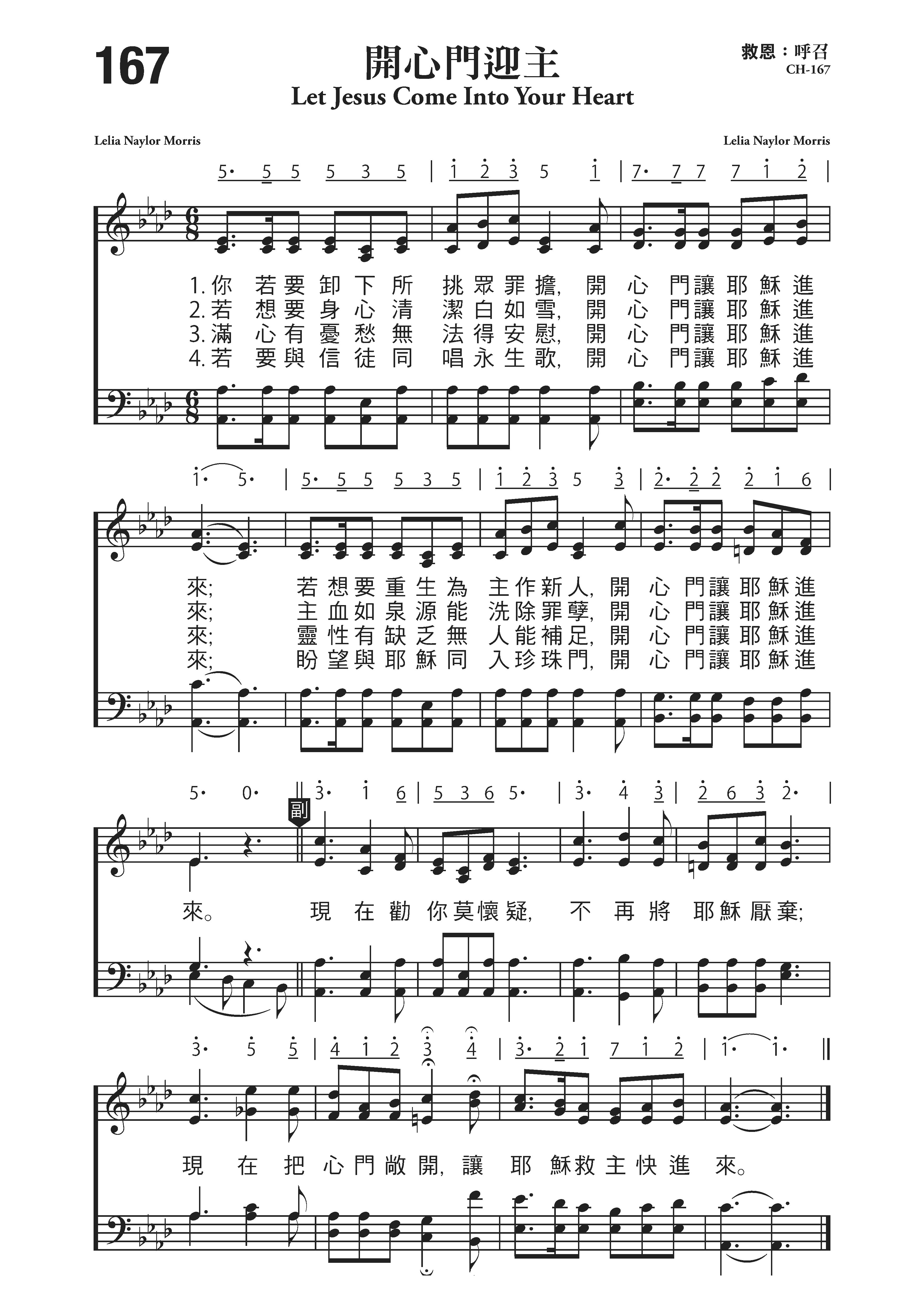 当天早上莫里斯夫人就写下了这首《开心门迎主》,为的是庆祝一个人的重生,更是作为圣灵的能力改变人心的见证。