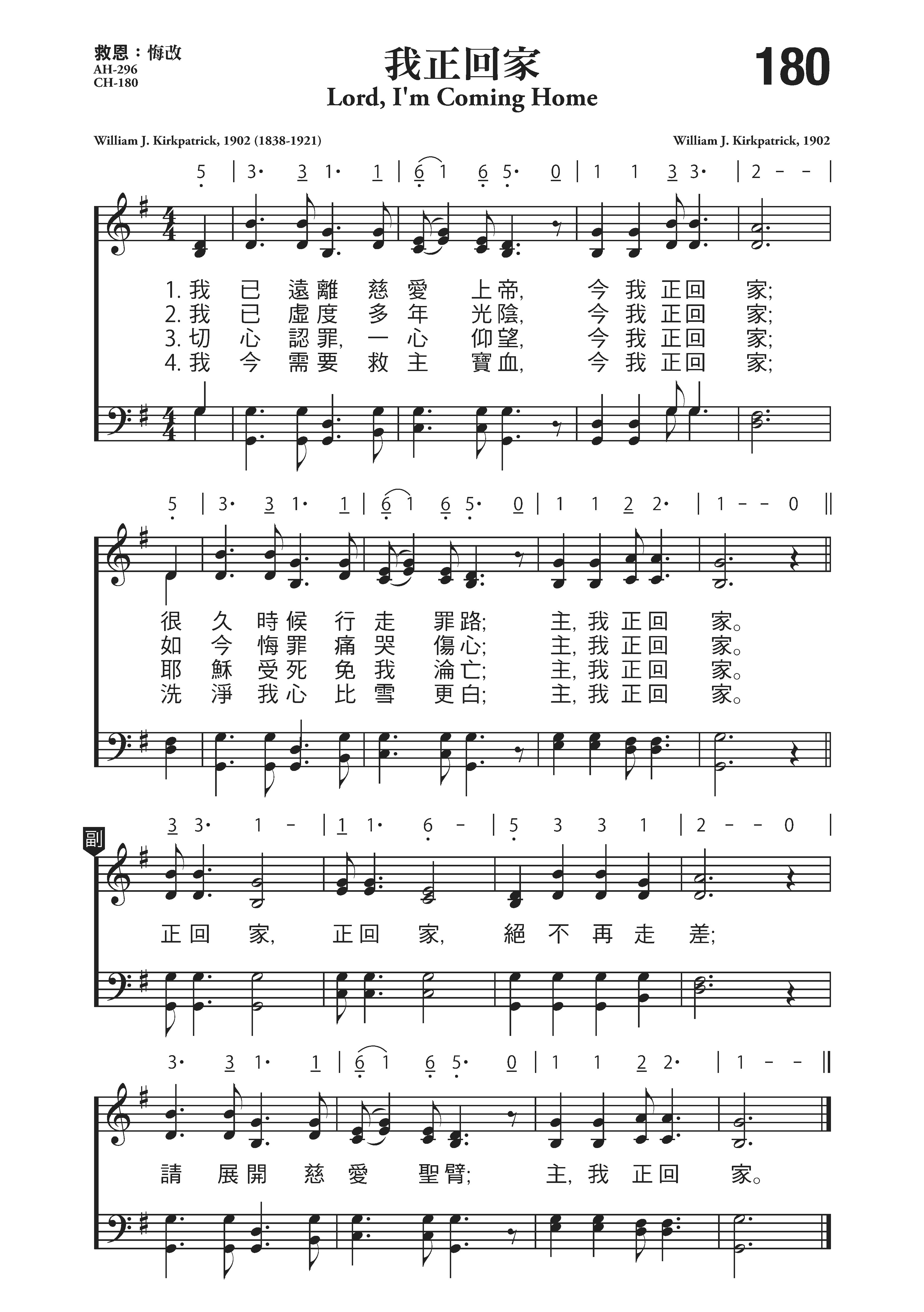 柯克帕特里克在宾夕法尼亚州的一次露营布道会上主领诗歌。他的一位担任独唱的助理有着优美的歌喉,其富于色彩的嗓音,往往使听众感动得流泪。但令柯克帕特里克感到难过的是,这位歌手还不是基督徒。他多么希望能把这位歌手争取到主的一边来啊!一天早晨聚会结束以后,他到帐篷里跪下祷告,求主给他一个信息,使他感能帮助这位助理悔改归主。他在不住祈祷的时候,脑海里出现了以下的诗句:“回家吧!回家吧!不要再游荡;慈爱天父伸开双手,渴望你回家。”于是他迅速着手写完这首诗,配上曲调,交给助理以一贯的热情和技能演唱,哪知圣灵藉着这首诗感动了这位助理悔改,进而又感动了千万人悔改,顺服基督。他们和那位浪子一同说:“我要起来,到我父亲那里去”(路15:18)。