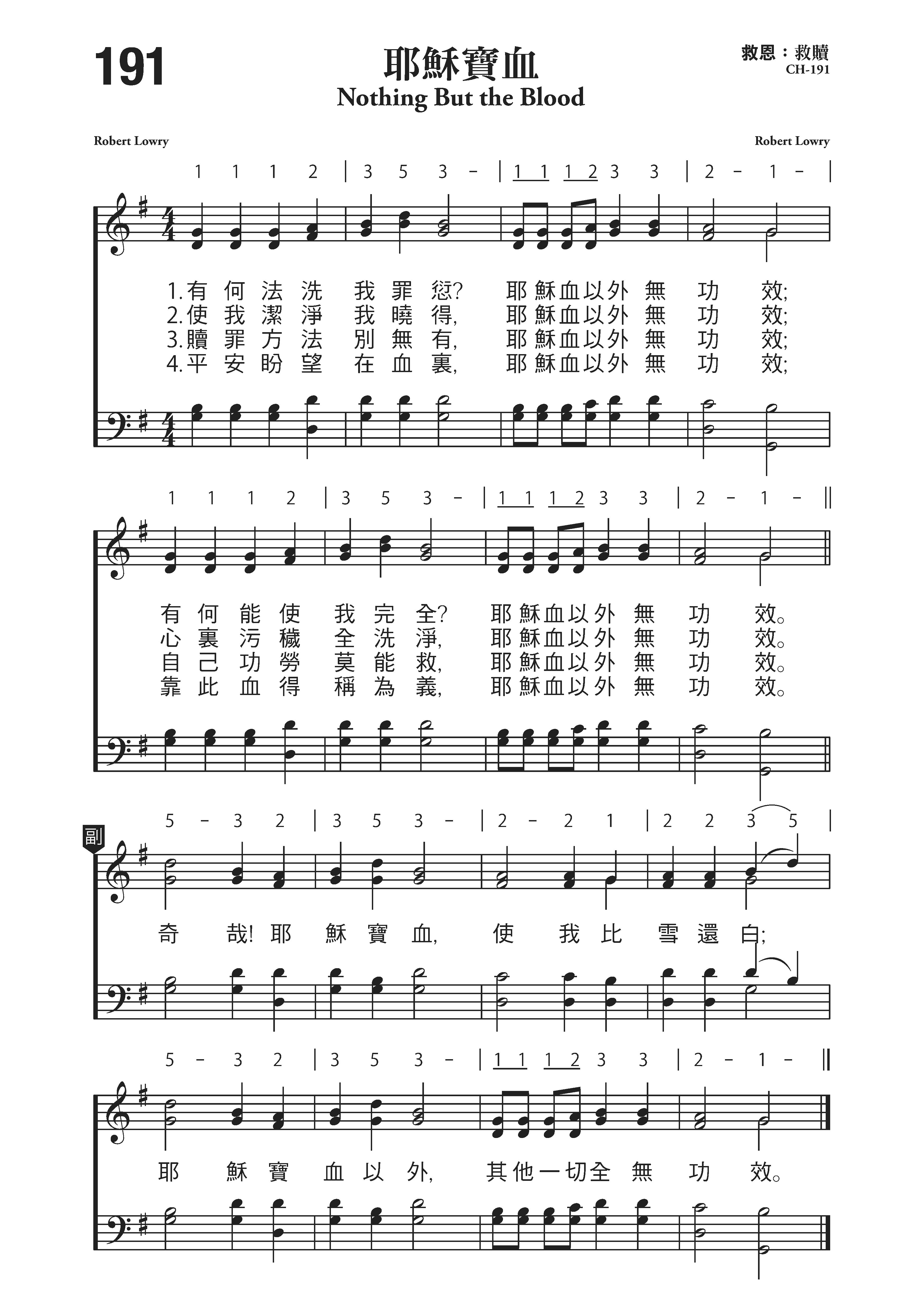 这首节奏明快,旋律动人的赞美诗讴歌了耶稣宝血的奇妙功效。它用非常简要的语言,说明了只有救主才能洗净人身上一切污秽罪孽,使人得称为义的道理。