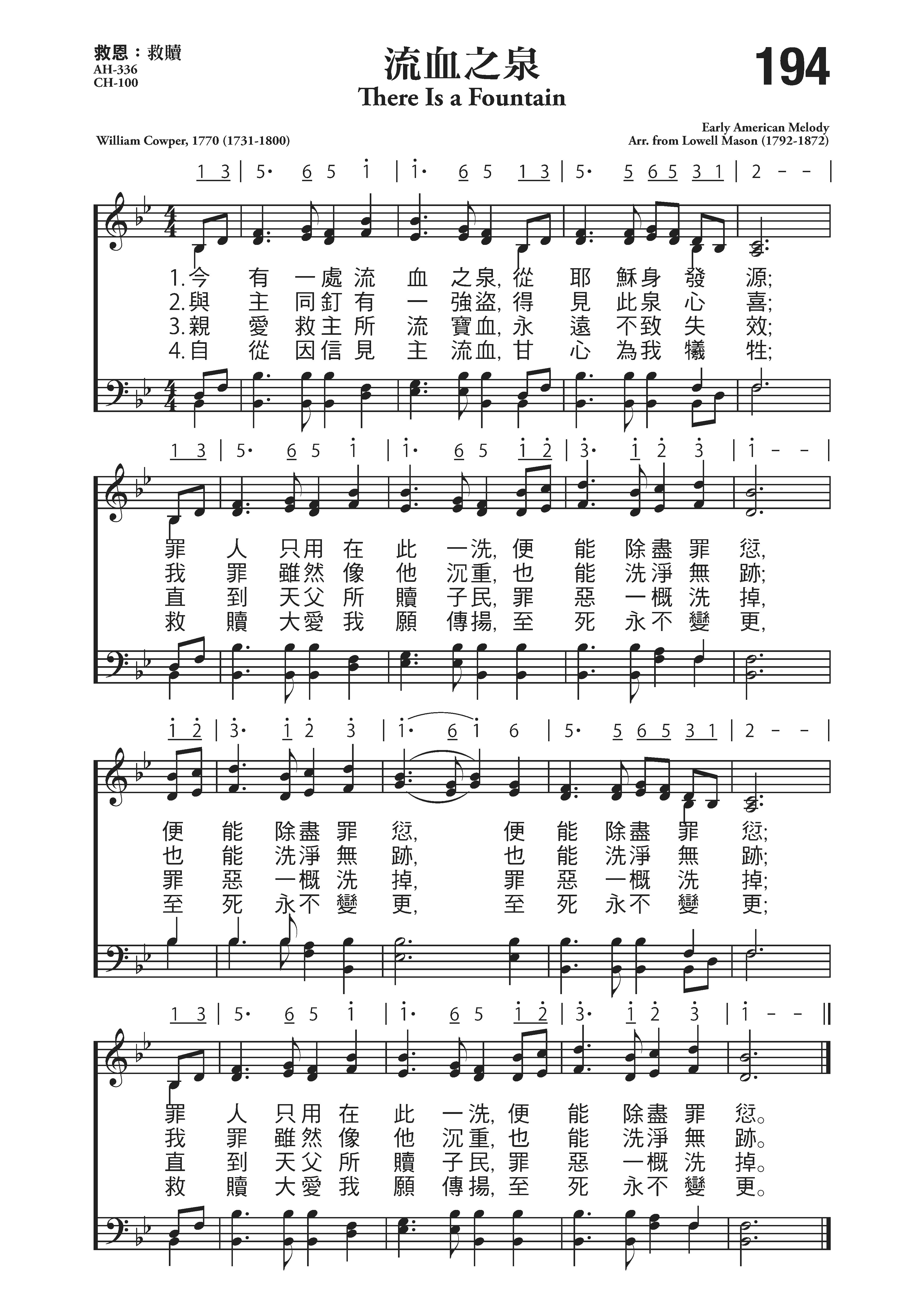 这首《 流血之泉》,曾感动无数罪人认识救主宝血洗除罪污的功效。原诗共有七段,是考珀迁居奥尔尼,住在福音派牧师牛顿家里写成的。
