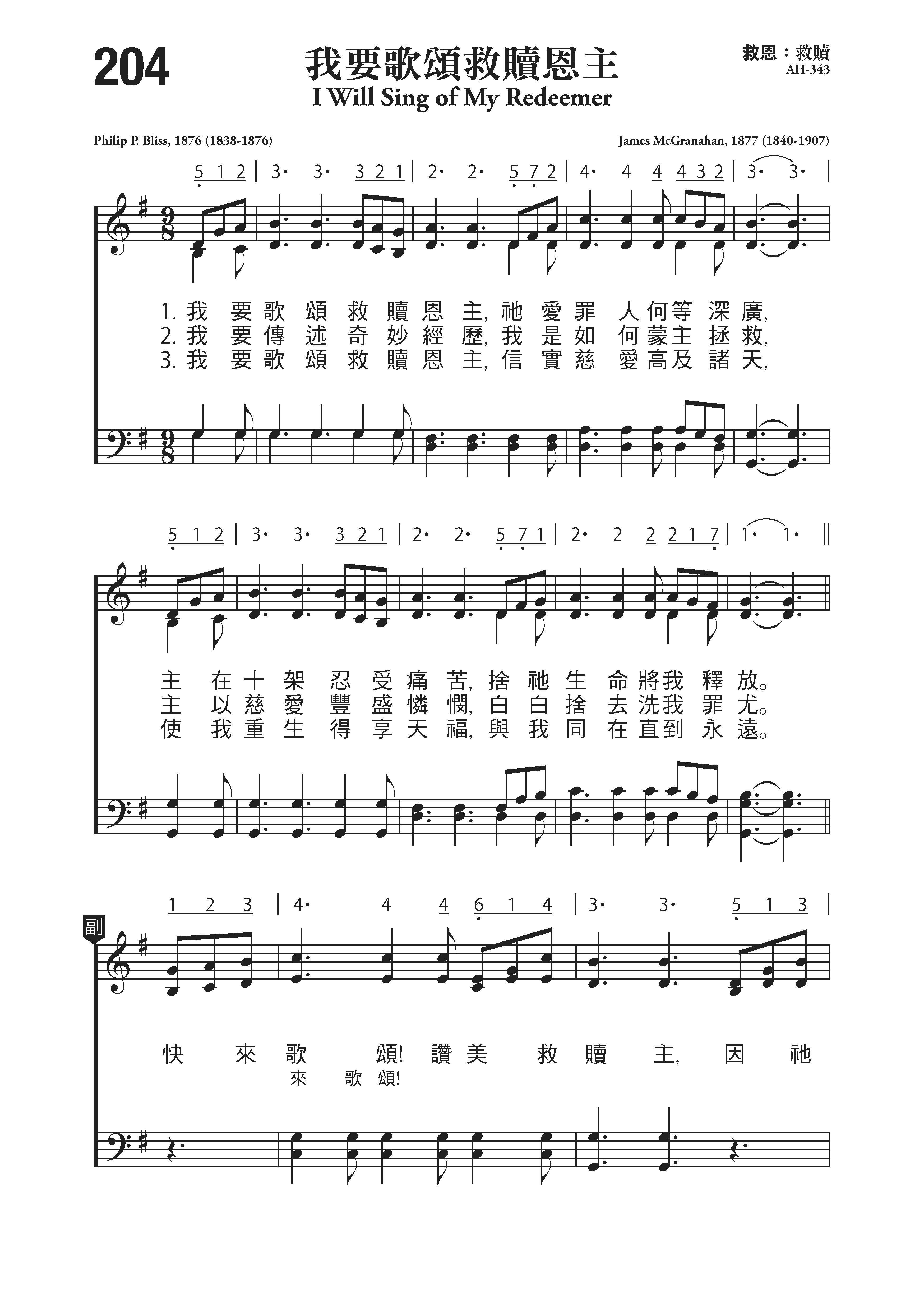 布利斯(P.P.Bliss 1838,7,9-1876,12,29见165首介绍)作词,麦格拉纳汉(James McGranahan,1840,7,4-1907,7,9,见117首介绍)作曲