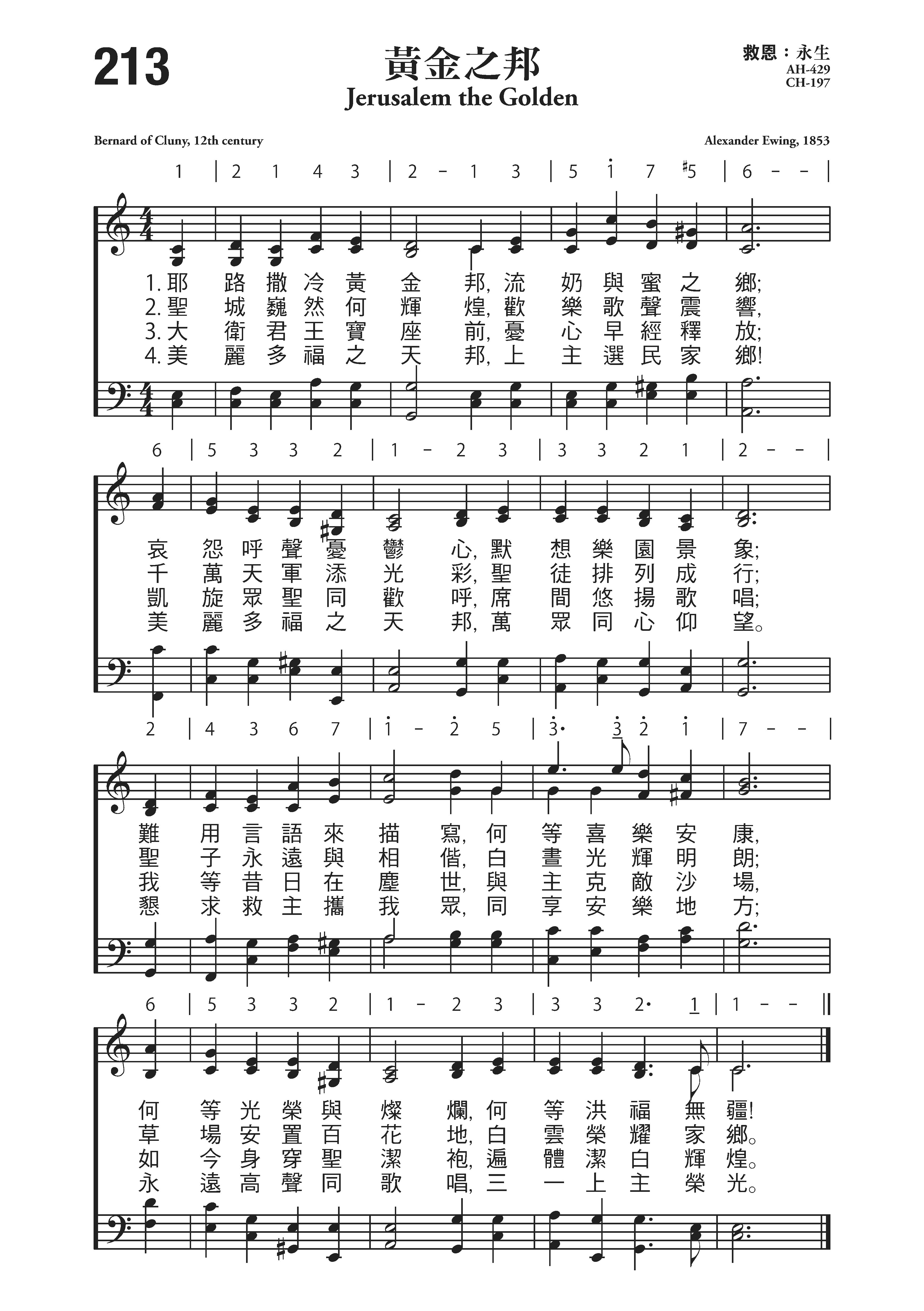 克拉尼的伯纳尔(Bernard of Cluny)作词(12世纪),尼尔(J.M.Neale,1818,1,24-1866,8,6)英译(1851年),尤因(Alexander Ewing,1830,1,3-1895,7,11)作曲(1853年)