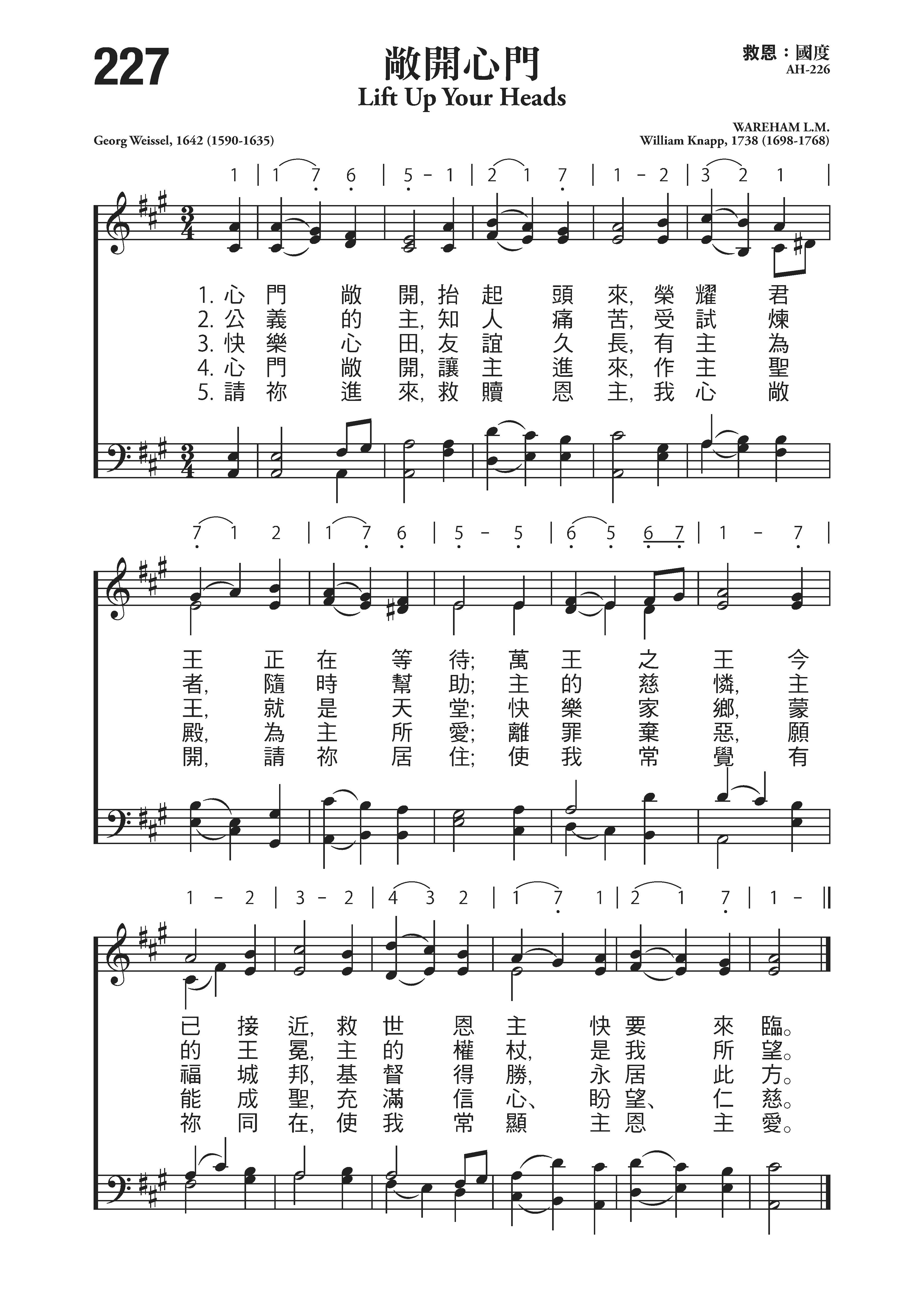 乔治.韦塞尔(Goerg Weissel,1590-1635.8.1)作词(1642年),凯瑟琳.温克沃思(Catherine Winkworth,1827.9.13-1878.7.1))英译(1853年 );威廉.纳普( William Knapp ,1698-1768)作曲(1738年)