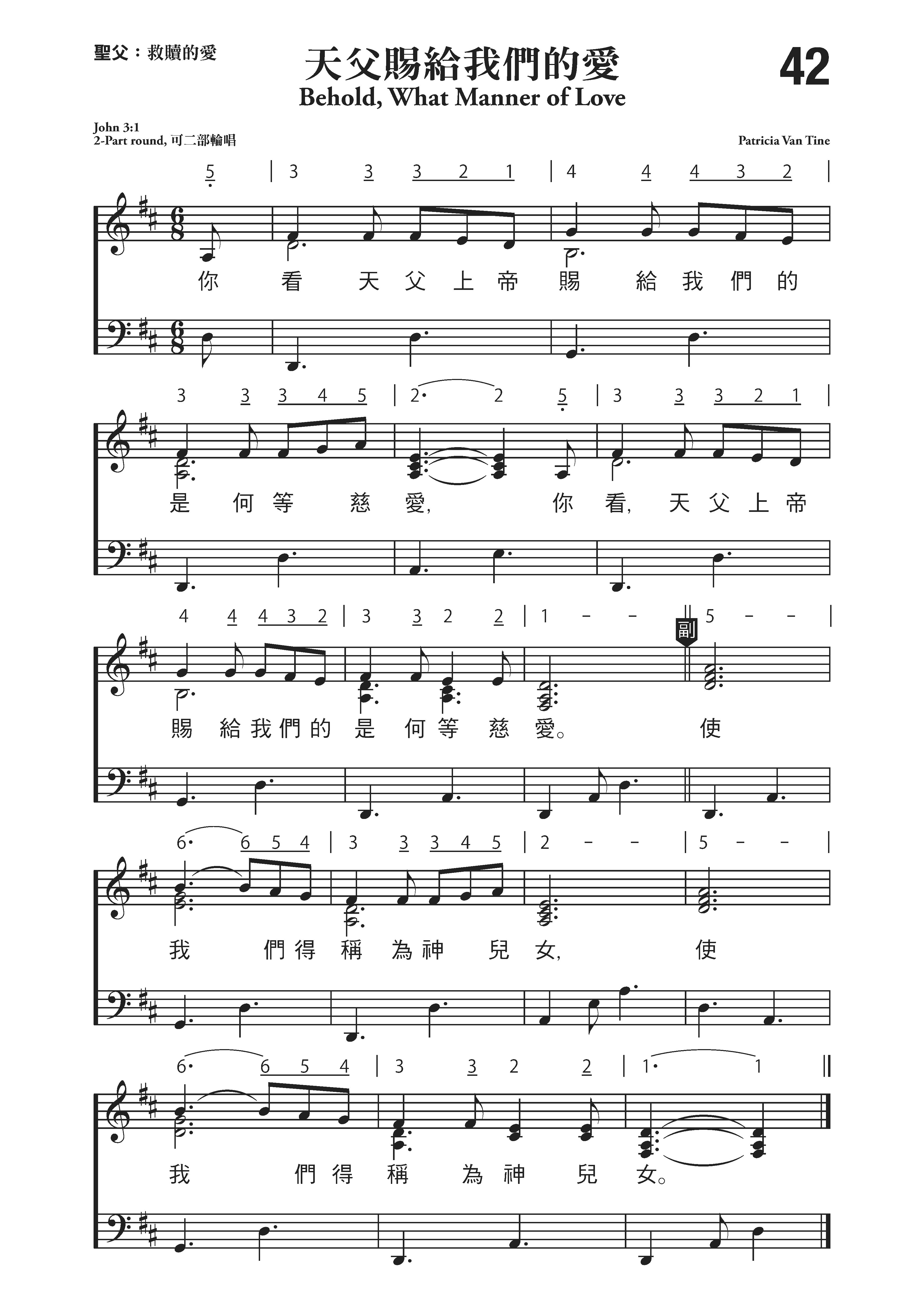 发布时间:2019-10-11 浏览: 次 编辑:admin 伴奏 示唱 第42首 天父赐给我们的爱 Behold,What Mannner of Love 歌词依据约3:1, 可二部轮唱;帕特丽夏.范汀(Patricia Van Tine) 作曲