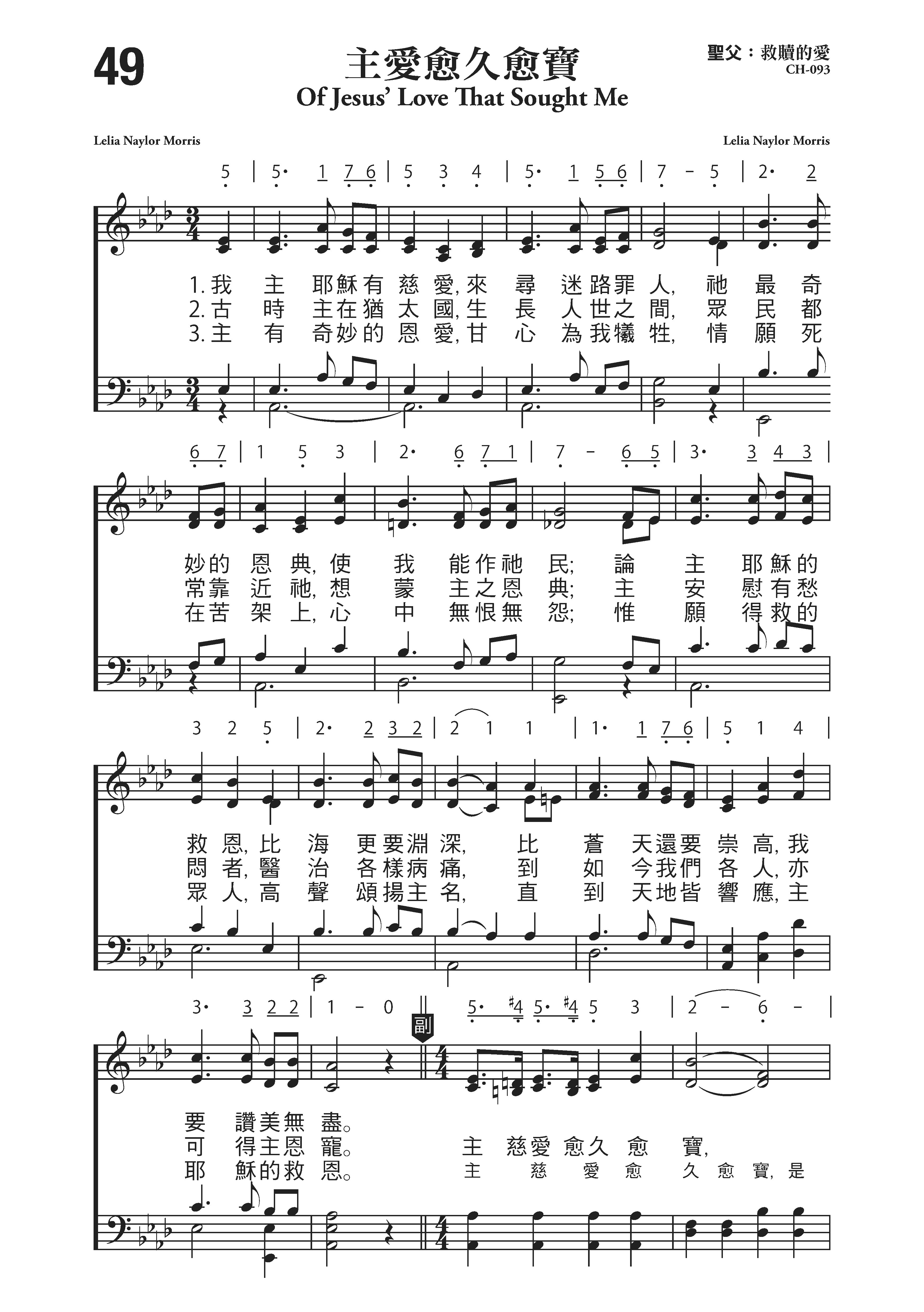 本诗的词曲作者莫里斯是一位美国热心爱主的女信徒。她自幼丧父,两姐妹由母亲经营一间杂货店维持生计,抚养成人。后来她与莫里斯结婚。夫妇二人志同道合,积极参加教会的各项活动,主持各种聚会,关心帮助信徒。莫里斯夫人还充分发挥自己的音乐天赋,创作了一千五百多首赞美诗,其中有许多都是她自己谱曲的。她的诗歌意境优美,旋律热情奔放,脍炙人口,深受欢迎。到了晚年,她虽然双目失明,爱主的心仍丝毫没有减退。她以乐观的精神继续传道创作,直到她歇下劳苦的担子,安息在主怀里。