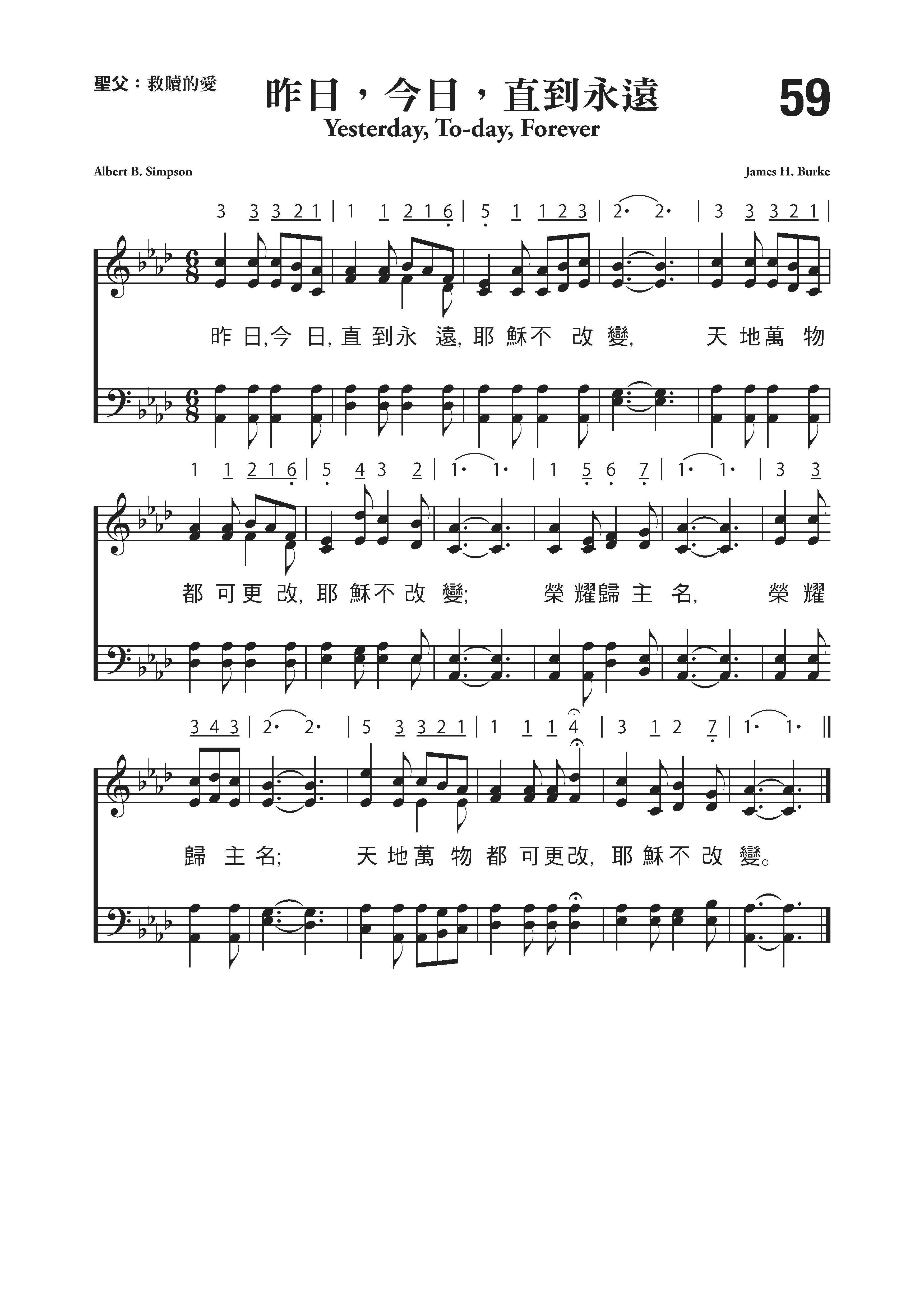 艾伯特.辛普森(Albert B.Simpson,1843-1919)作词;詹姆士.伯克(James H.Burke,1858-1901)作曲(1890年)