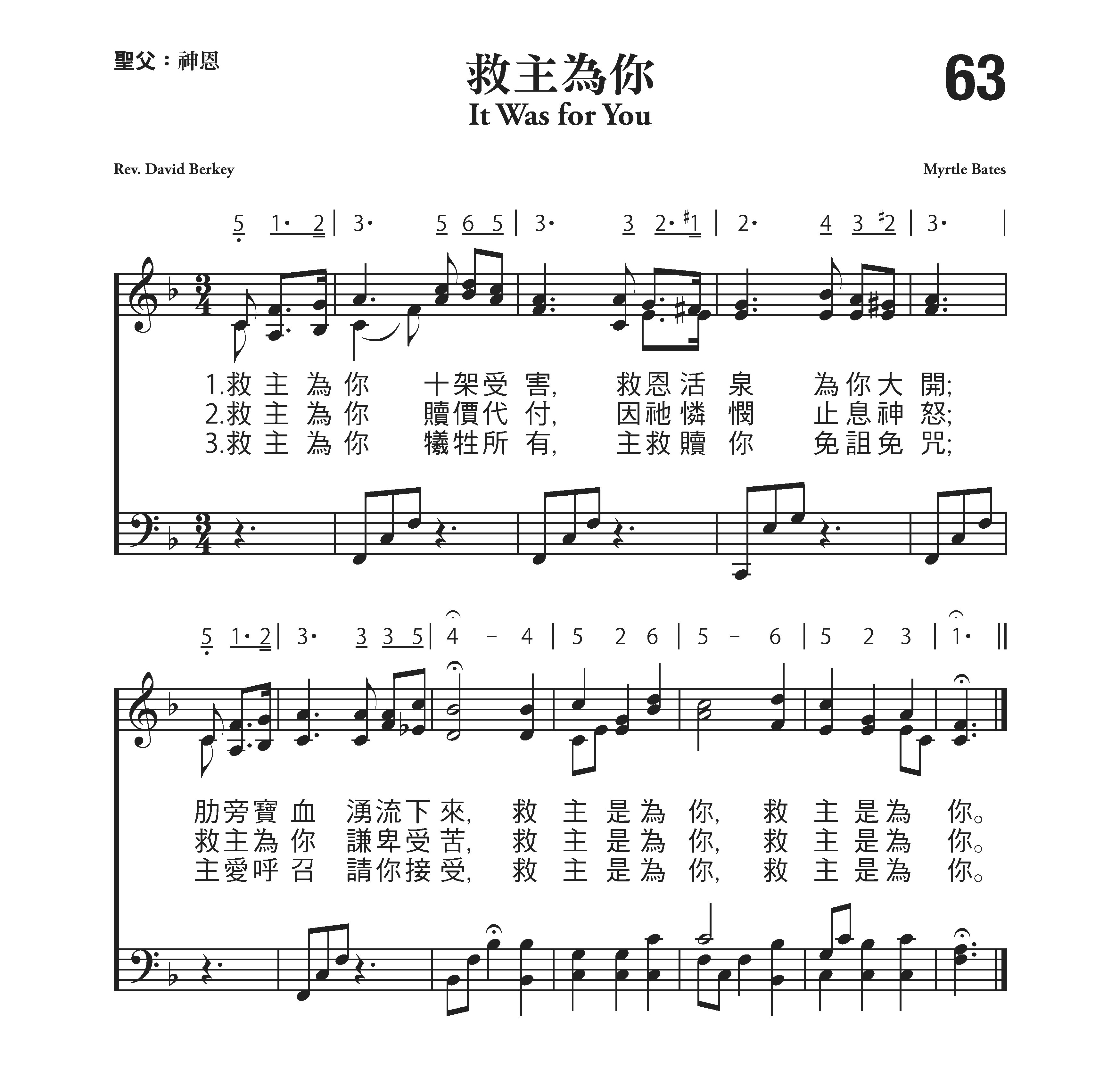 发布时间:2019-10-11 浏览: 次 编辑:admin 伴奏 示唱 第63首 救主为你 It Was for You 大卫.伯克(David Berkey)作词;默特尔.贝茨( Myrtle Bates)作曲