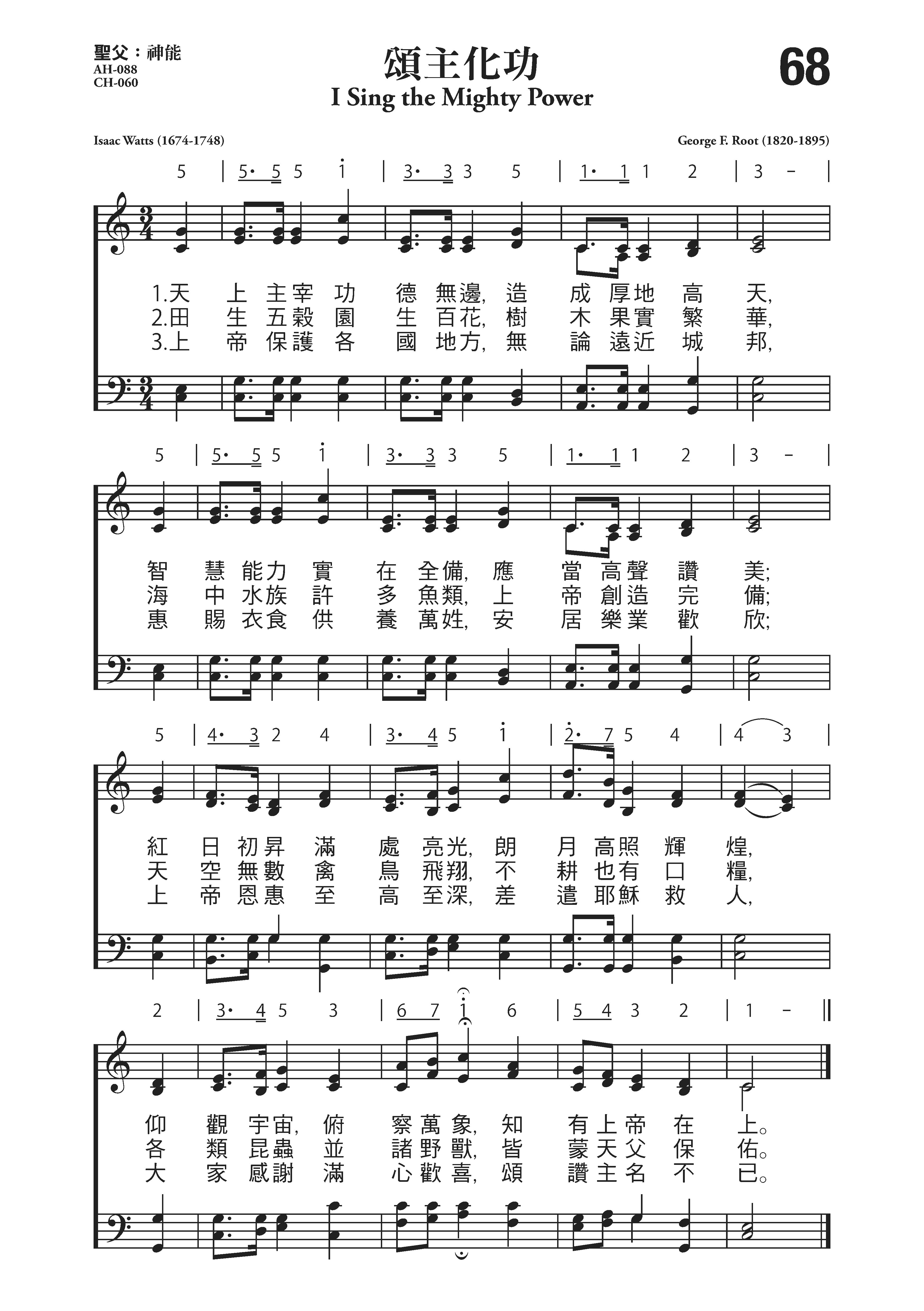 这首诗歌的首句为“颂赞上帝功德无边,创造大地诸天,”最早发表于瓦茨(见31首介绍)在1715年编辑出版,为儿童所写的圣诗集内,原题为《颂赞上帝创造与天恩》,全诗共八段,一般赞美诗选其中三段或四段。