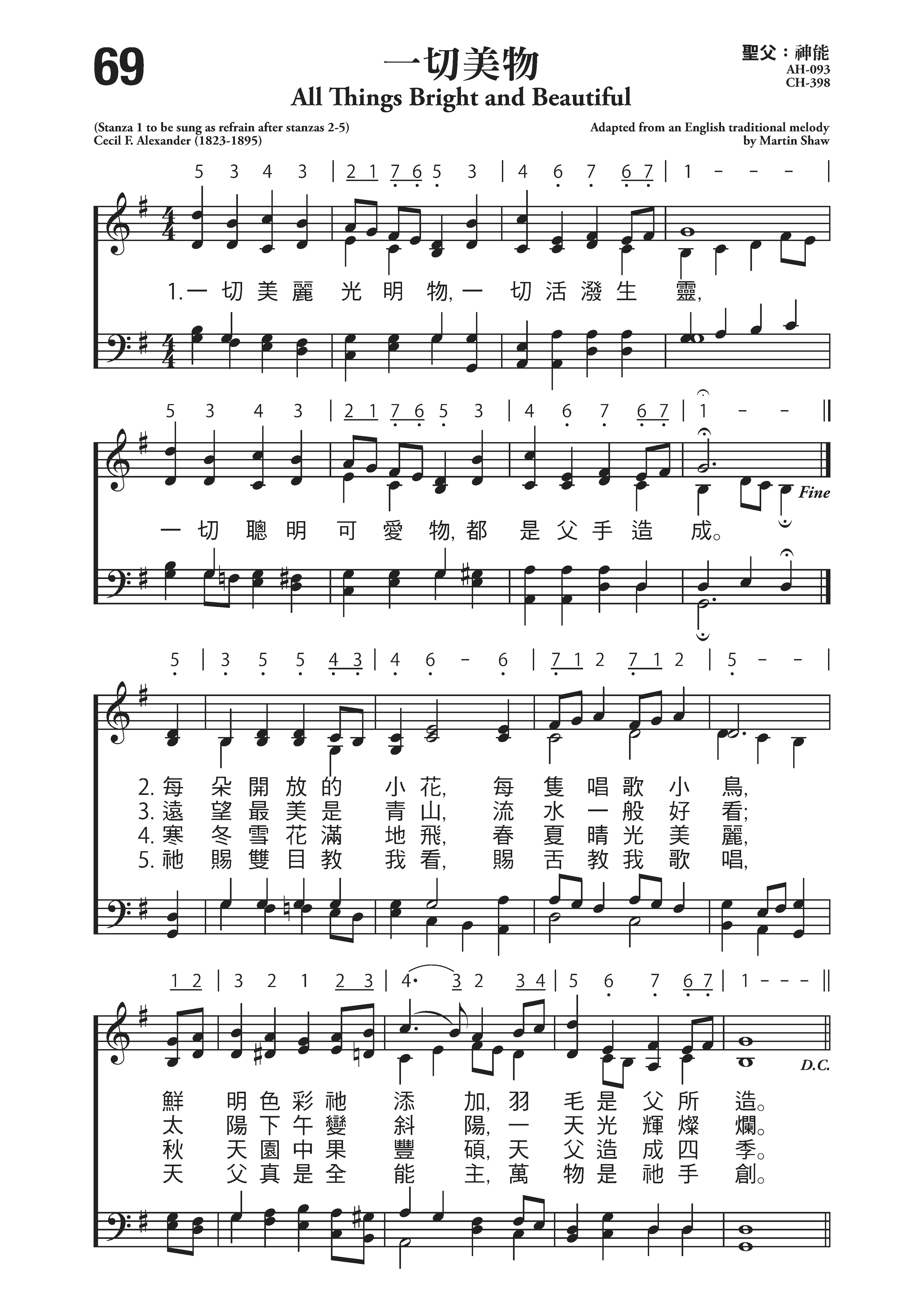 塞西尔.弗兰西斯.亚历山大(Cecil Frances Alexander,1818-1895,10,12)作词(1848年,马丁.肖(Martin E.F.Shaw,1876,3,9-1958,10,24)据英国传统曲调改编