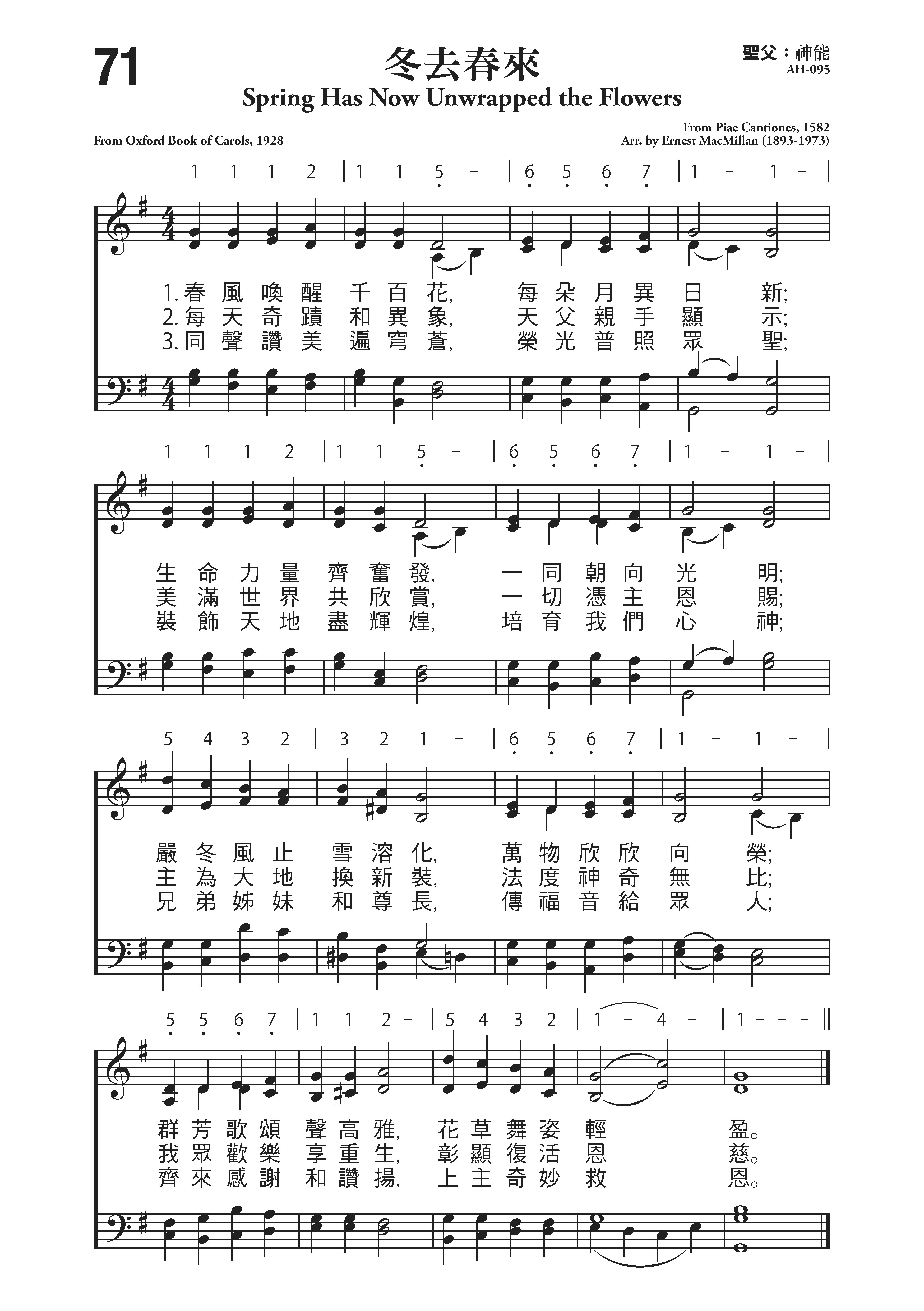 迪德里可.佩特里(Didrik Petri, 1560- 1617,生平不详)作词,选自《伦敦颂歌集》(1928年版);旋律来自中世纪的芬兰圣诗集(Piae Cantiones,1582年),欧内斯特.麦克米伦(1893.8.13-1973.5.6)编配
