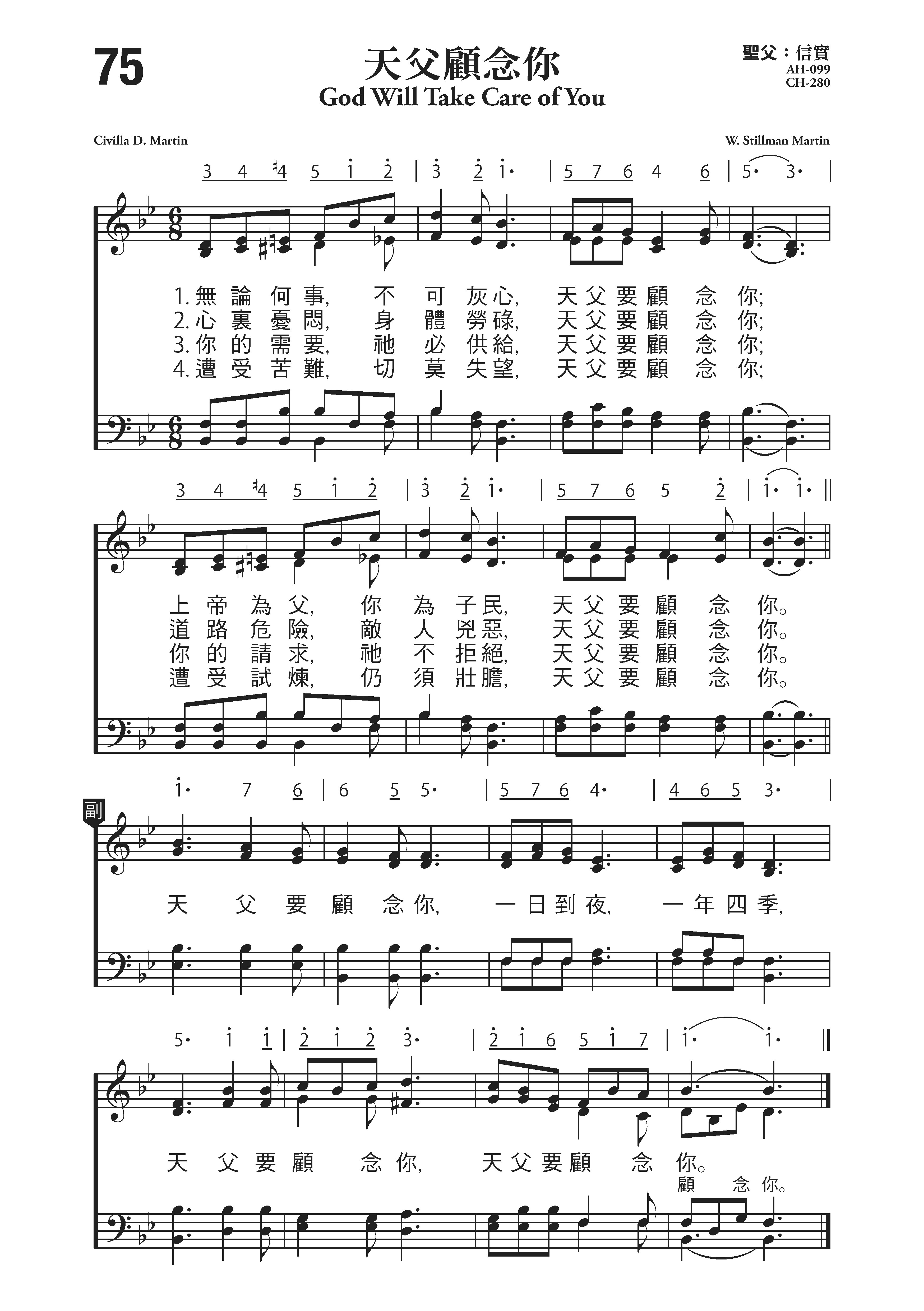 本诗的作者茜微拉.马丁原是加拿大一个小镇的小学教师。与马丁牧师结婚以后,运用自己的音乐天赋,协助丈夫从事布道工作。沃尔特.马丁毕业于哈佛大学,任浸信会牧师,后来参加了基督门徒会,在美国各地旅行传道,主持圣书讲座,深受欢迎。有一次他应邀外出讲道,夫人却卧病不起,让他放心不下。正当他犹豫不决之际,他们的一个孩子说:“爸爸,您尽管去吧,天父一定会看顾妈妈的!”马丁听罢,大受感动,就前去讲道。下午回来时,马丁夫人已经写好了这首《天父顾念你》。马丁看了以后,当即为它谱曲。这首优美动听的赞美诗就这样诞生了。当天晚上在教堂首唱,感动了不少的人。在以后的岁月里,这首诗歌给历经坎坷,身患重疾,客居他乡,软弱疲惫的无数信徒带来很大的安慰和帮助。