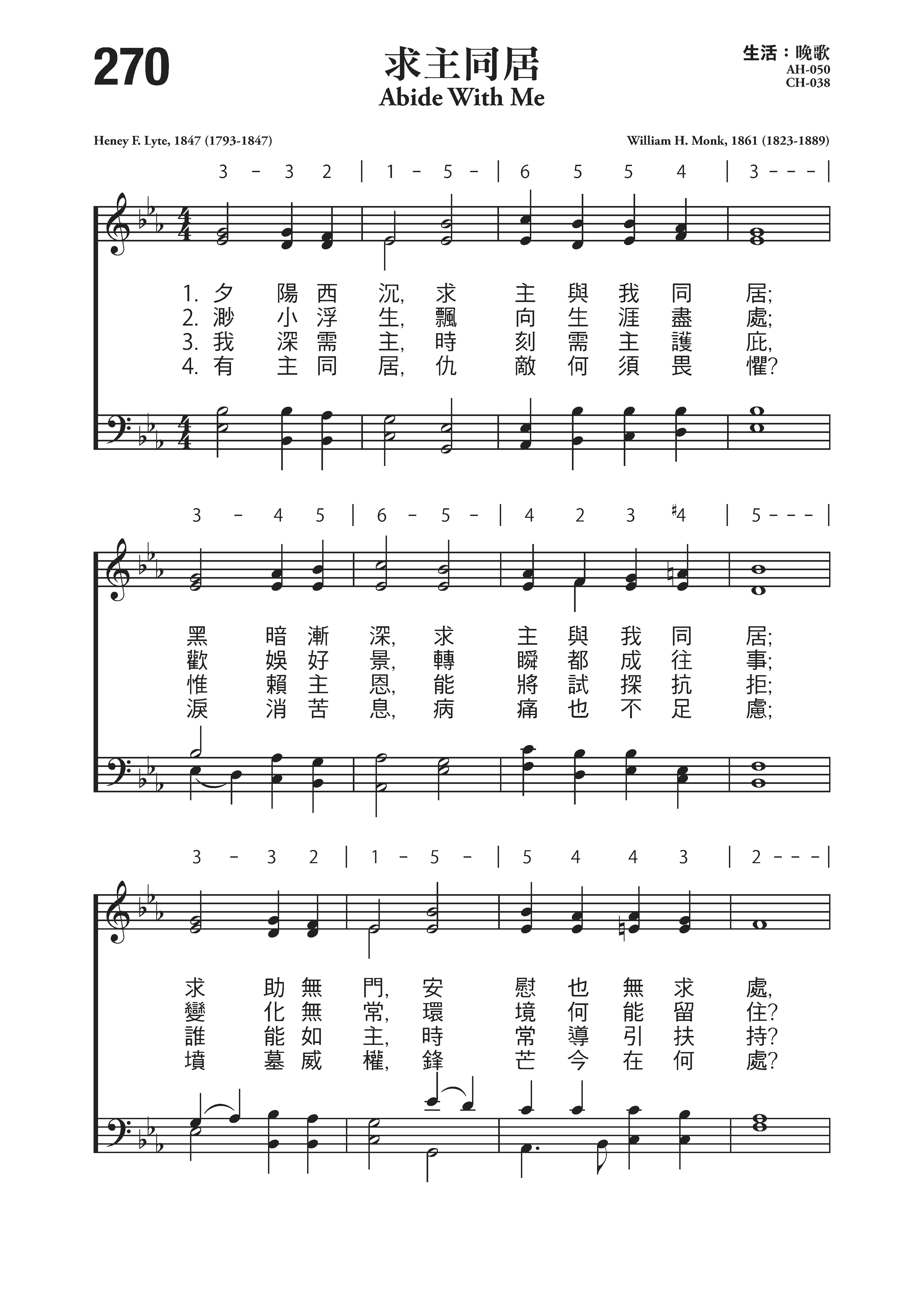 这是一首适于信徒临终时所唱的非常美好的赞美诗。一位牧师弥留之际对他的妻子说:“我如果离世,不要请唱诗班为我唱别的歌,我只希望我们教会的全体信徒都能在我身边唱这首《求主同居》。”