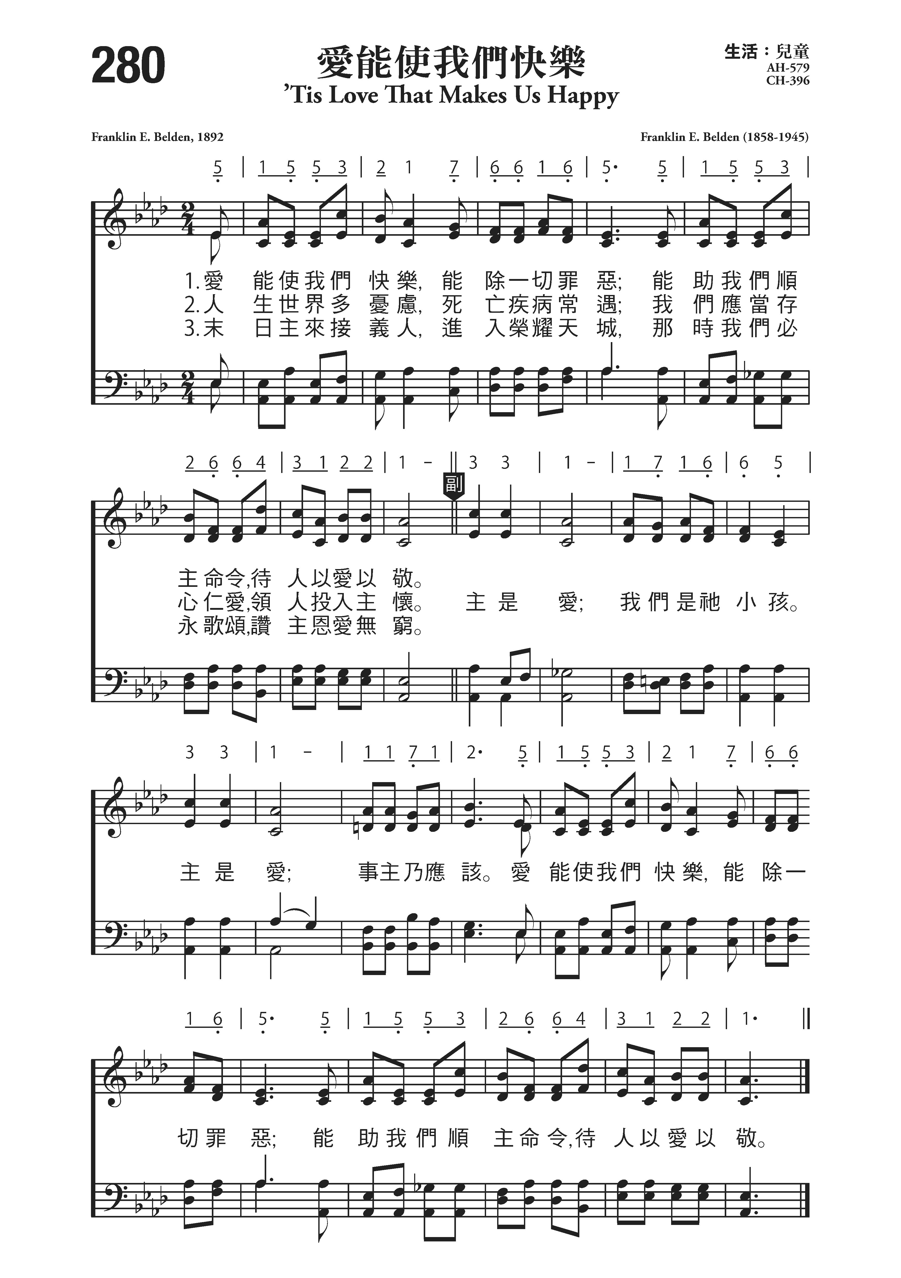 第二节说明只有把主所赐的仁爱之心接纳在心中,我们才能克服人生道路中的一切忧患和痛苦。第三节把画面推到光荣的未来。那时我们依然要凭着这颗爱心讴歌主的大恩大德。诗歌的副歌说:“主是爱,我们是祂小孩,主是爱,事主乃应该。”把主的爱与人生的本分有机地联系在一起。