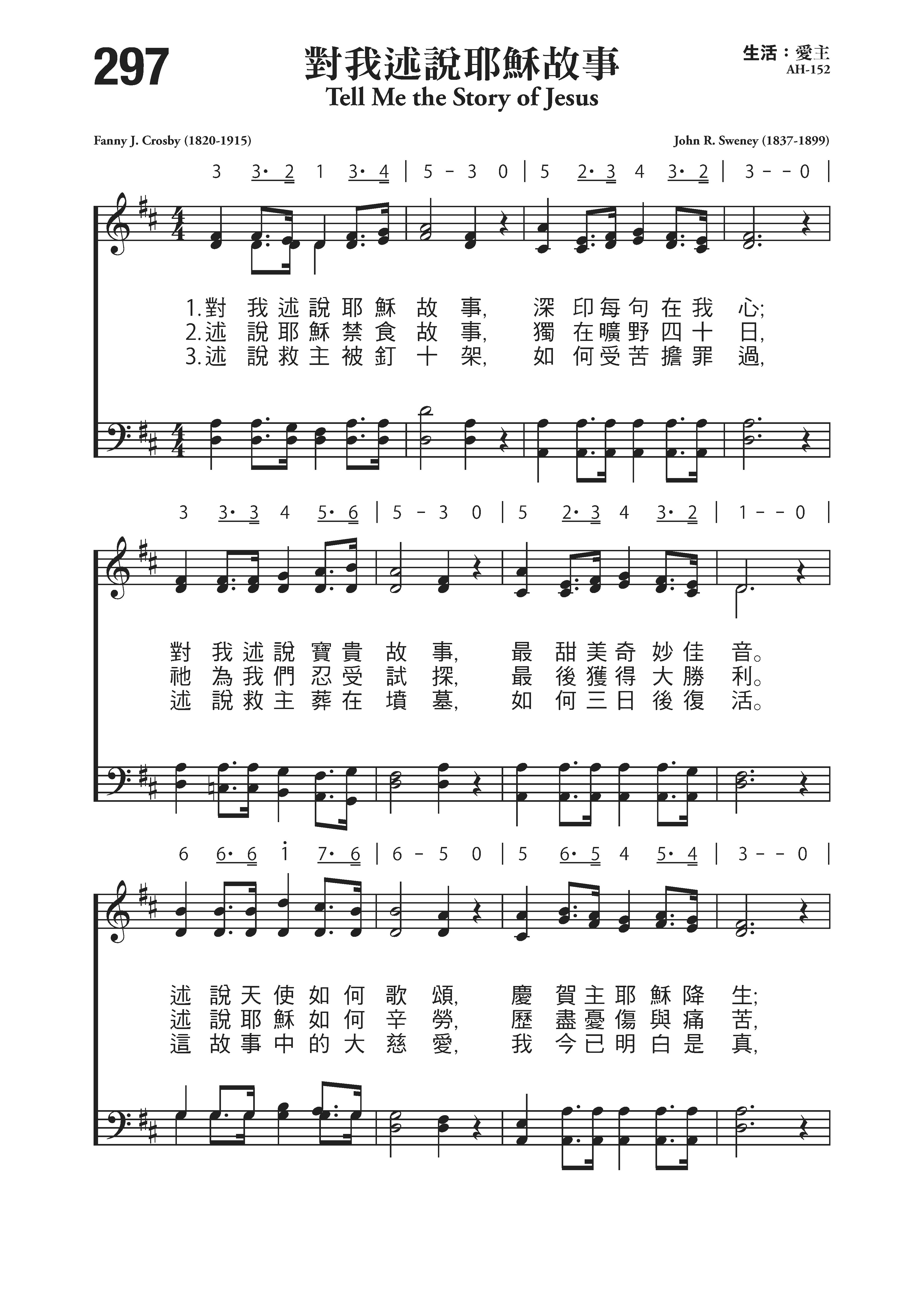 发布时间:2019-10-17 浏览: 次 编辑:admin 伴奏 示唱 第297首 对我述说耶稣故事 Tell Me the Story of Jesus 克罗斯比(第见12首介绍);斯威尼(见《赞美诗》第113首介绍)作曲