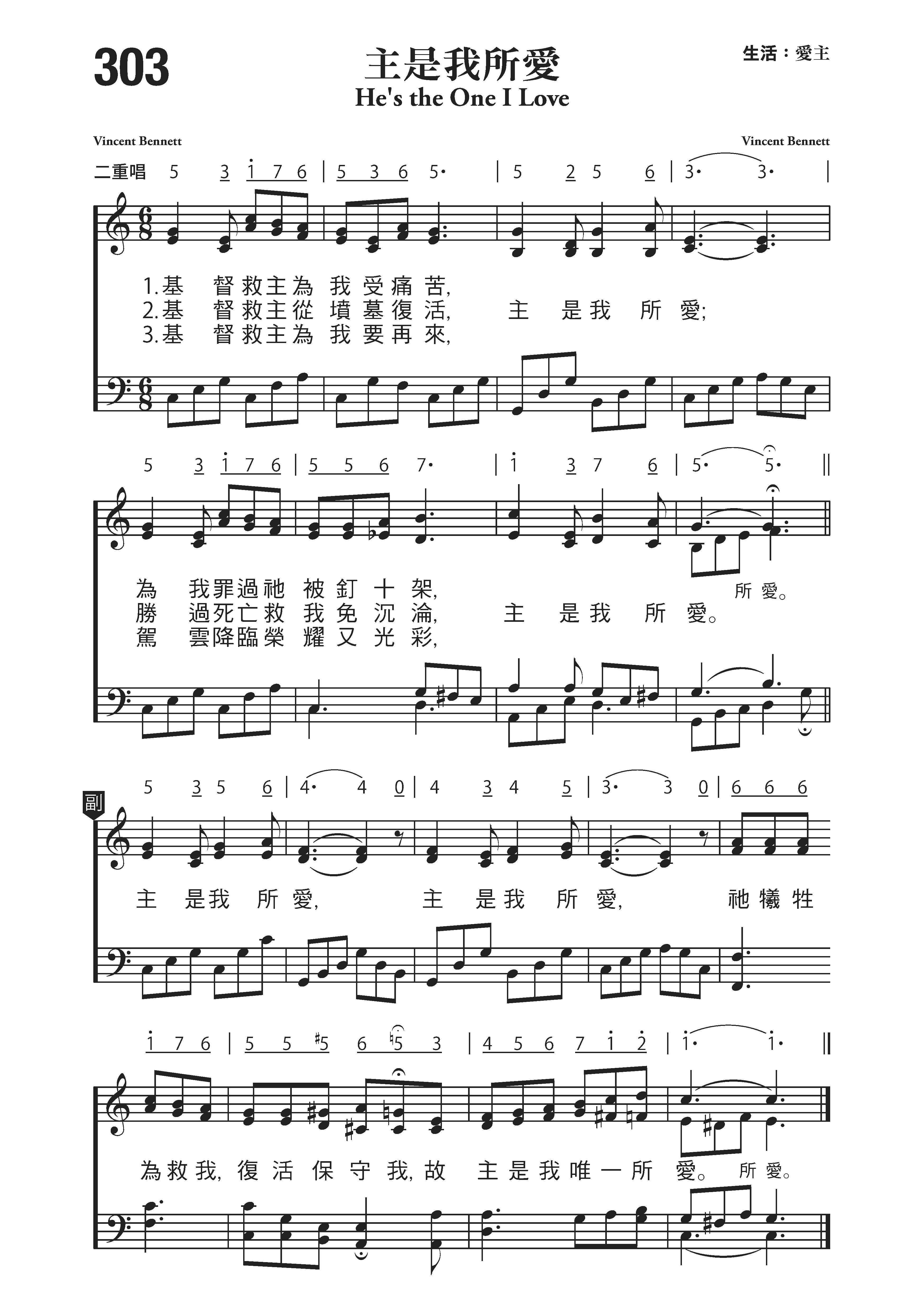 发布时间:2019-10-17 浏览: 次 编辑:admin 伴奏 示唱 第303首 主是我所爱 He’s the One I Love 文森特.贝内特(Vincent Bennet,生平不详)作词作曲