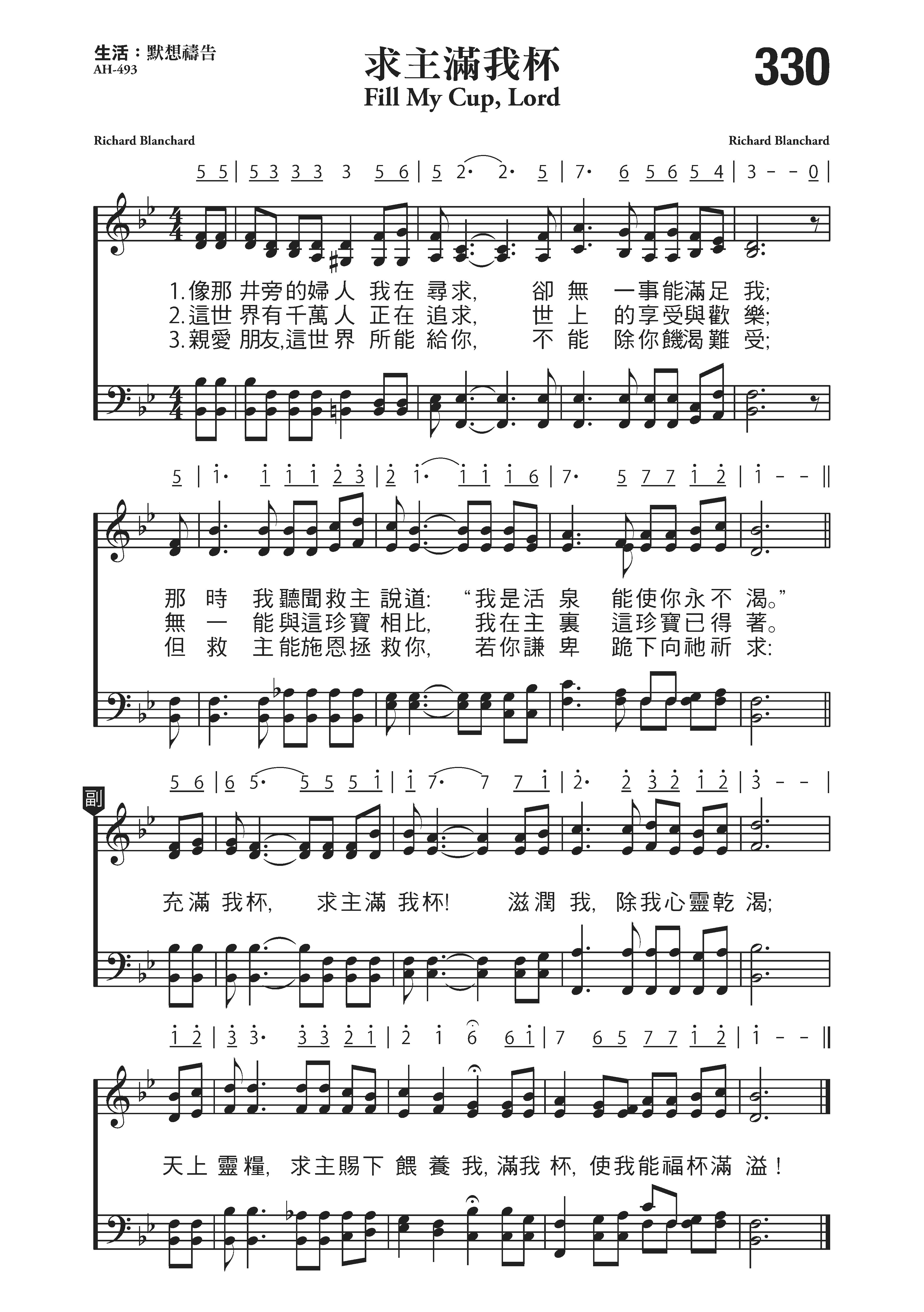 1962年,在佛罗里达州的一个奋兴会后,布兰查德演奏《求主充满我杯》给比尔.曼(Bill Mann)听。 二年以后比尔.曼将它灌制成唱片,销售逾百万张。 有一次比尔.曼在英国的一个大布道会中演唱。 会前有人递给他一纸条,首相夫人请他在会中唱《求主充满我杯》。