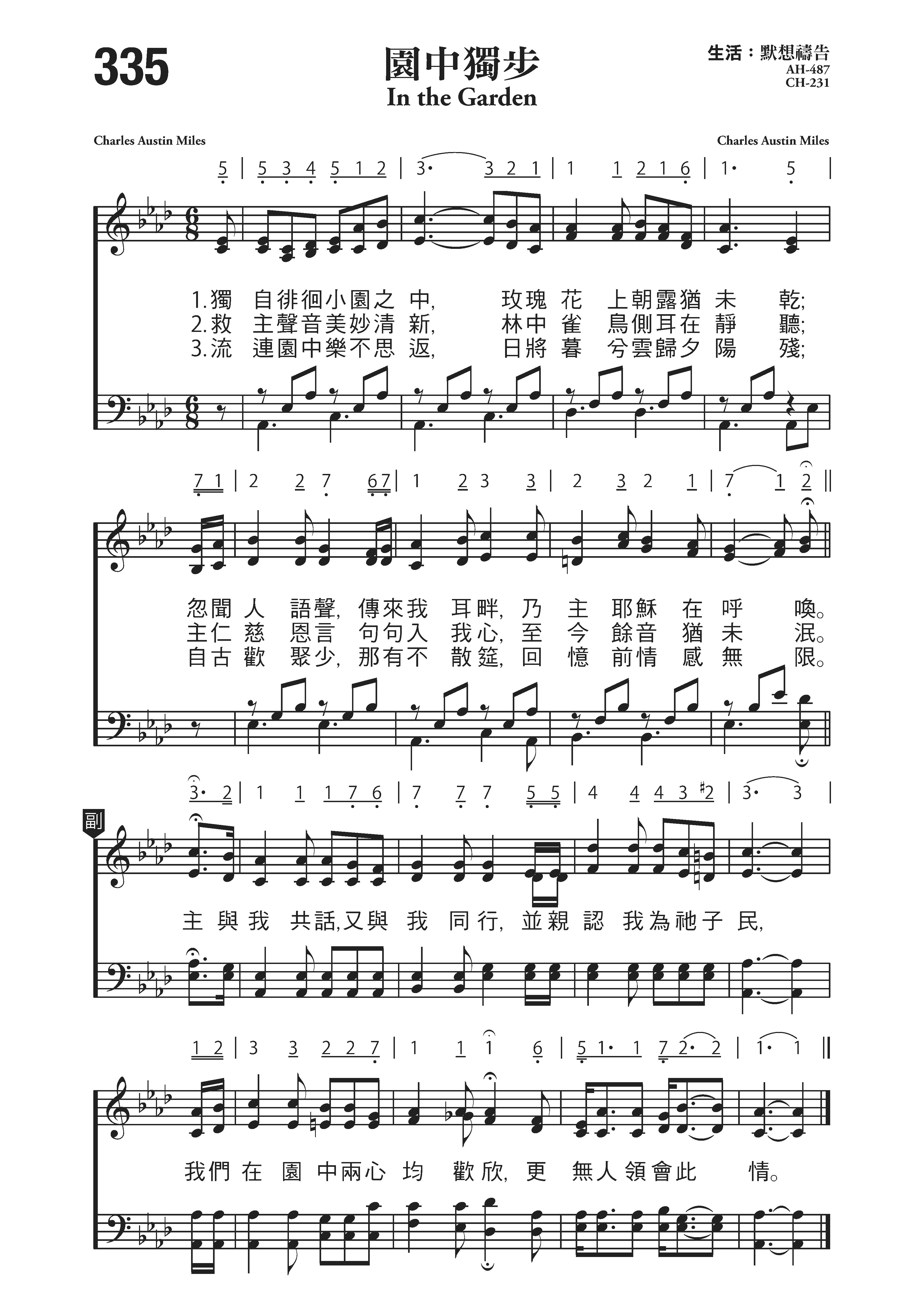 人们所熟悉的《荣美福地》(吉林版231首,《赞美诗》新编319首)也是迈尔斯作词作曲的。
