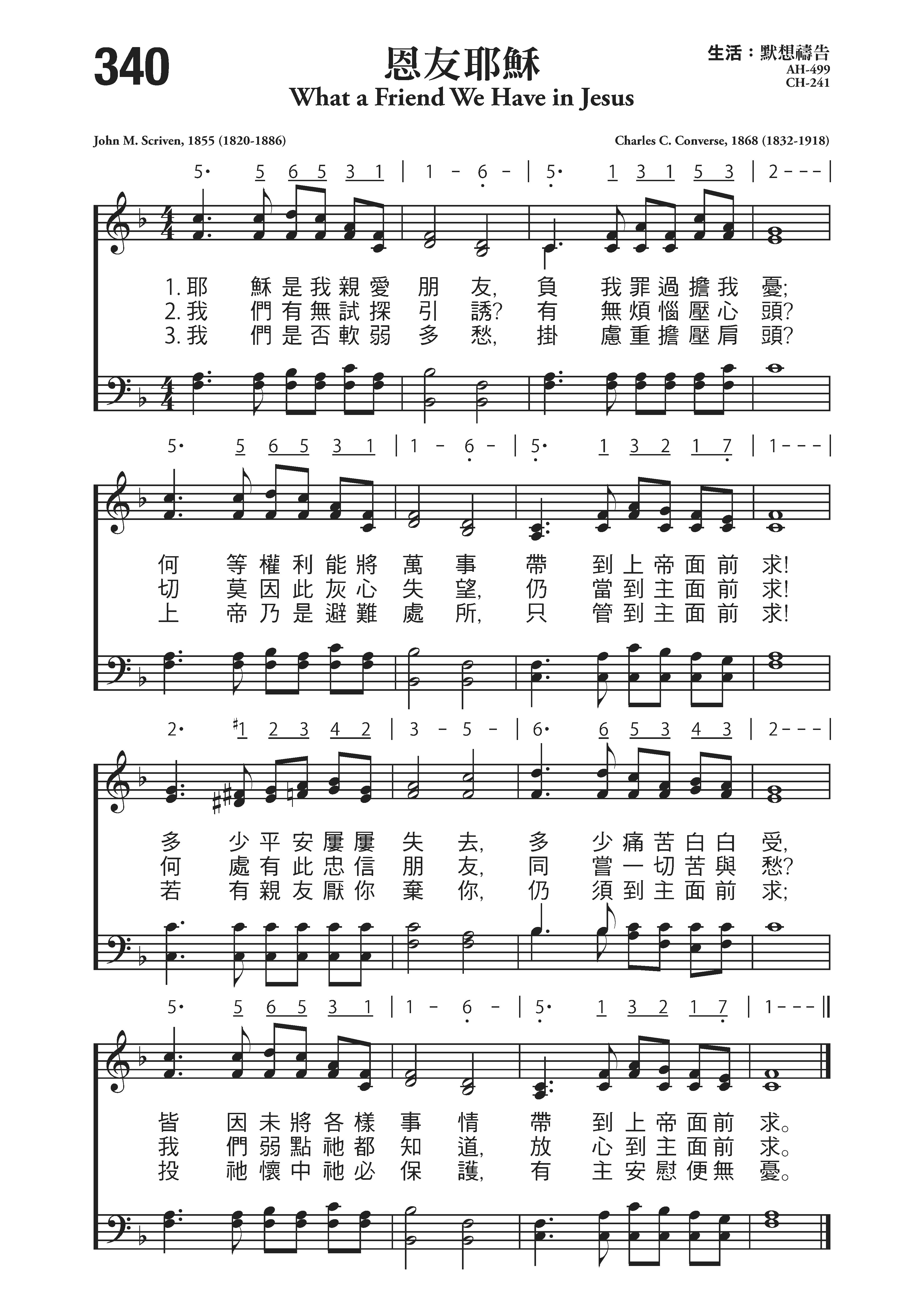 斯克利文(John.M.Scriven.1819,9,10-1886,8,10)作词(1855年),康弗斯 (Charles.C.Converse,1832,10,7-1918,10,18)作曲(1969年)