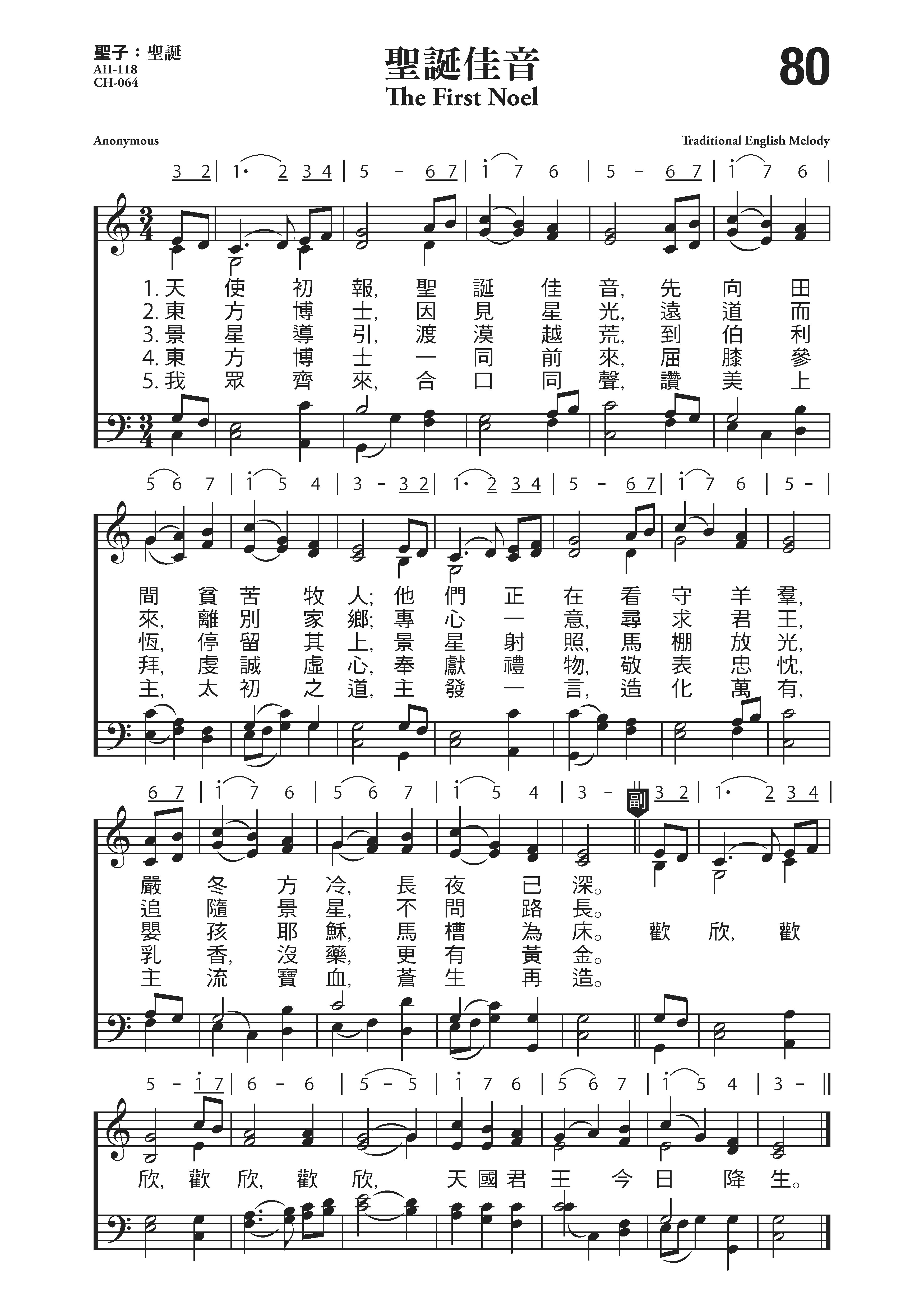 这是一首历史悠久的英国传统圣诞民歌,词曲作者均无从查考。其全部歌词都是根据圣书有关耶稣降生的章节编写而成。诗歌用平实动听的旋律,向我们述说两千年以前发生在犹大伯利恒的感人故事,把我们的心带到了道成肉身,降世为人的救主身边。每一段最后的副歌“欢欣,欢欣,欢欣,欢欣,天国君王,今日降生”又表达了我们每一个人感戴基督莅临的欢乐心情。