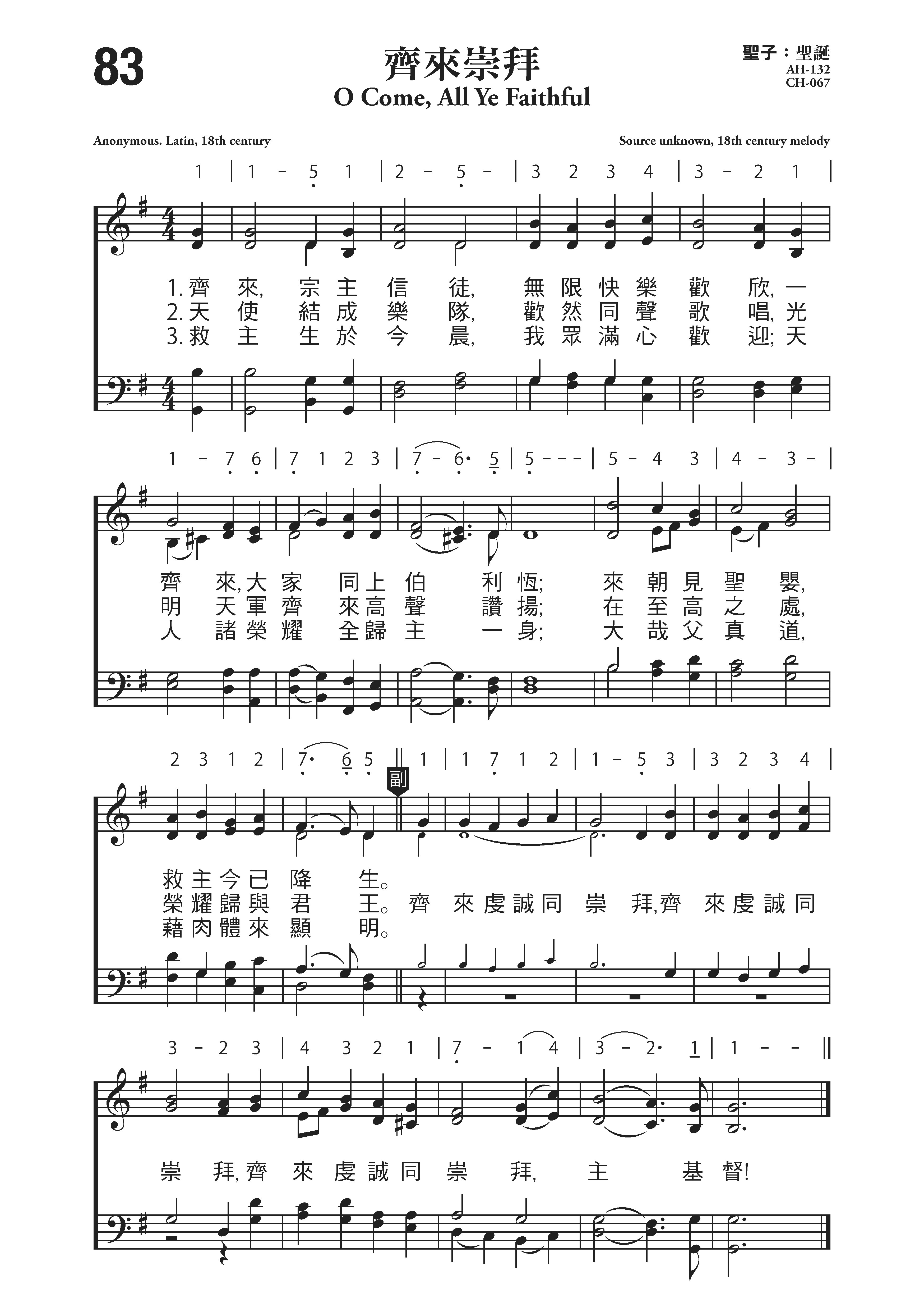 这是一首传统的圣诞歌曲。作者佚名。但我们知道它是法国人韦德(J.F.Wade,1710-1786)抄写出来的。他住在法国杜埃,以抄写乐谱为生。是他把这首诗抄在天主教的《教会歌曲集》中,才流传至今。原诗是拉丁文。1841年由奥克利(F.Oakeley,1802,9,5-1880,1,29)等人译成英语。奥克利从牛津大学毕业后任教,1832年人圣公会牧职,1845年转入天主教。