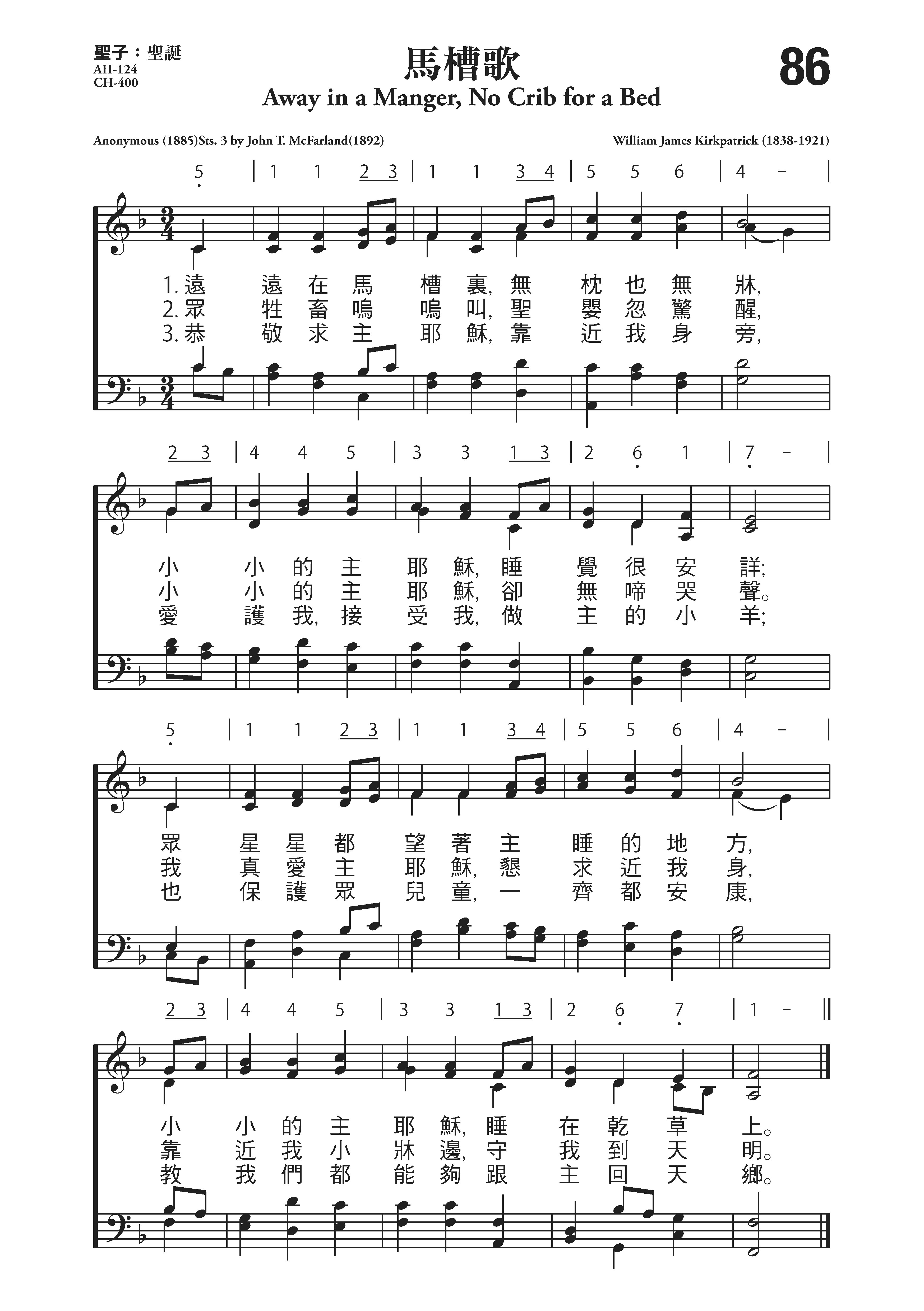 过去一直认为《马槽歌》是马丁.路德所作。但根据学者最近的研究成果,这首诗歌的第一和第二节是1883年一位美国信义会信徒为纪念马丁.路德诞生400周年而写的(作者姓名失传),第三节是1904-1908年间美国卫理公会会督安德森请他的朋友——卫理公会主日学总干事夏法兰所添上的一节祷词。