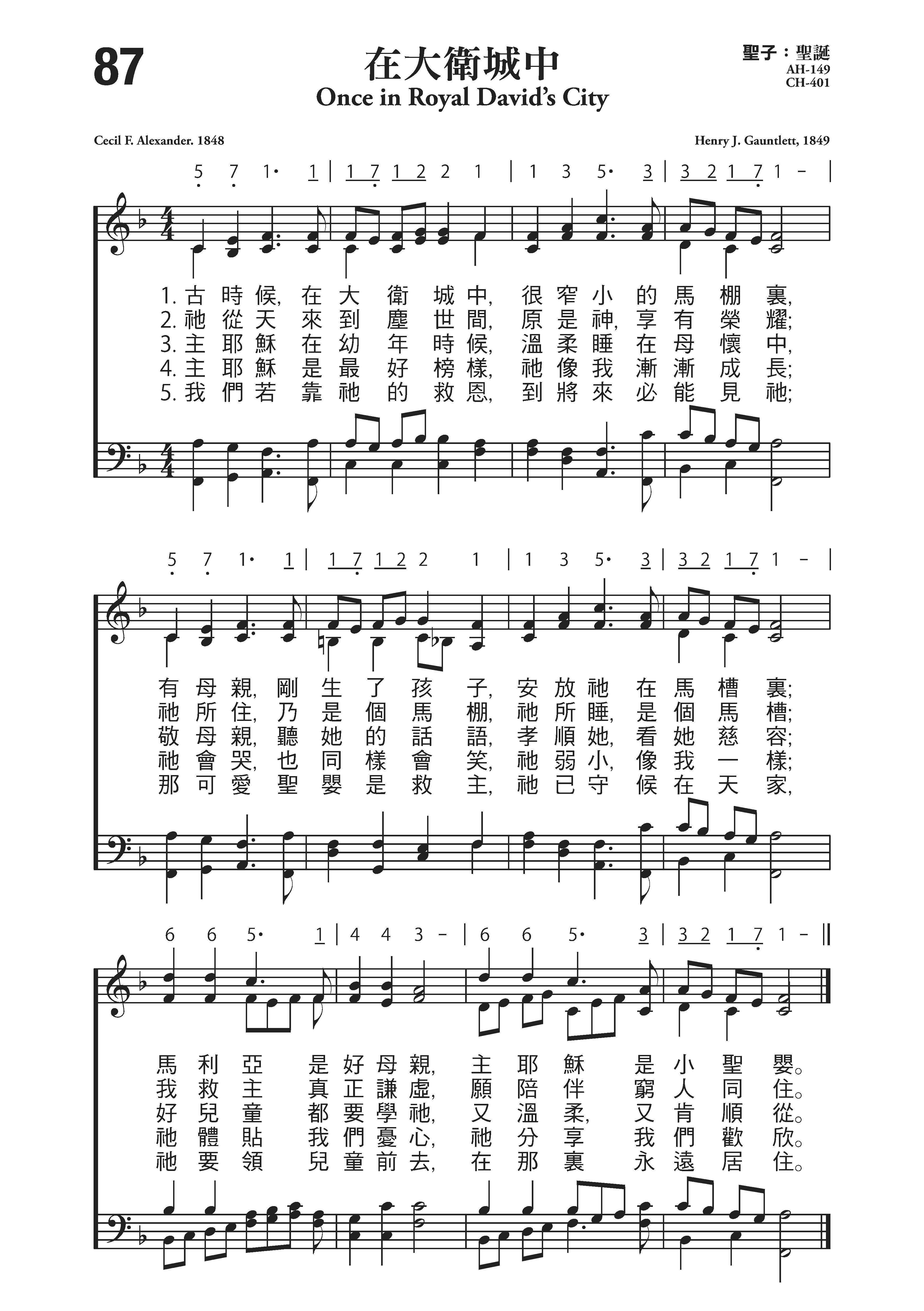 亚历山大夫人(见《赞美诗》第69首介绍)作词(1848年),冈特利特(Henry John.Gauntlett,1805,7,9-1876,2,21)作曲(1849年)