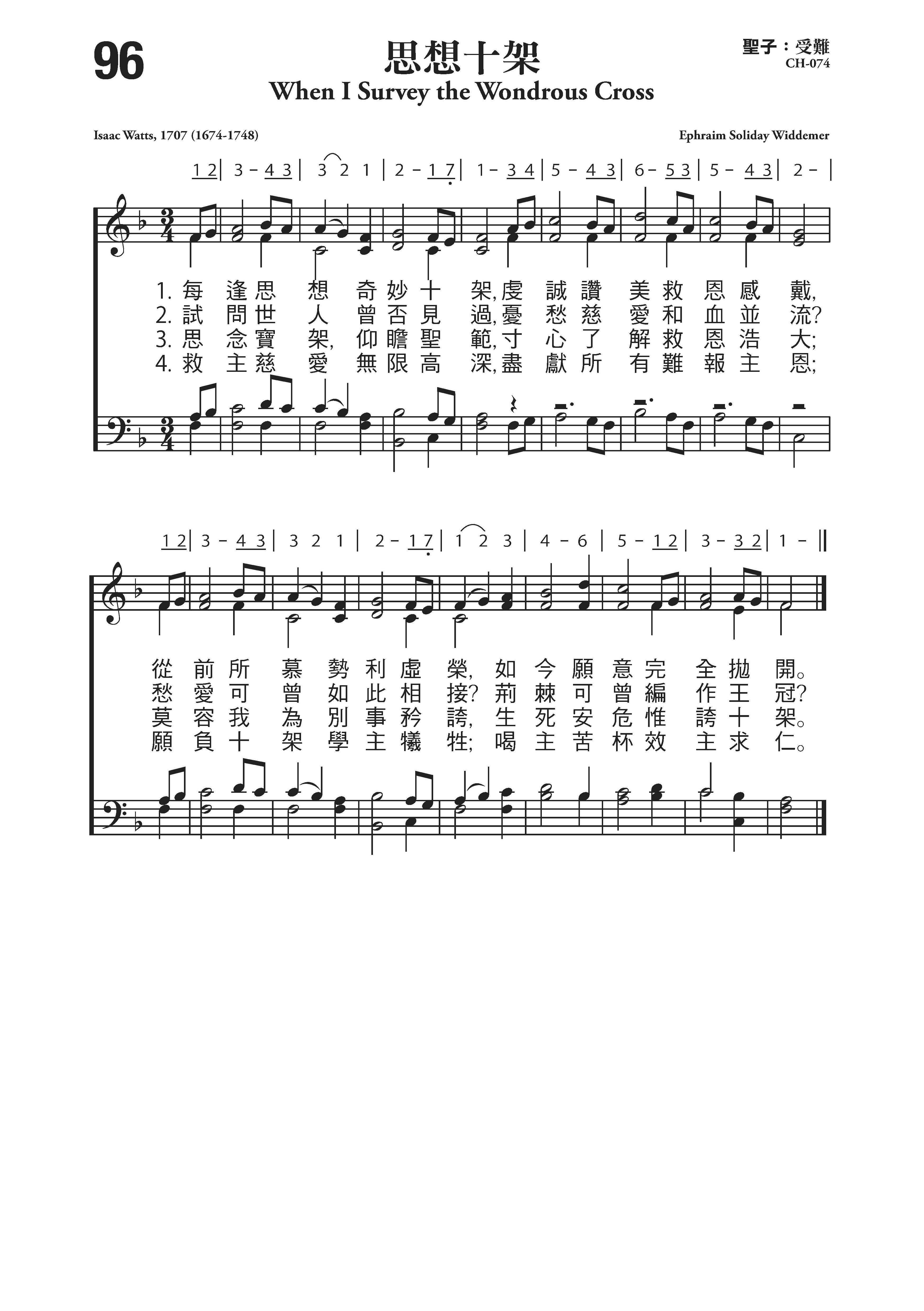 《思想十架》是英国圣诗之父瓦茨(见《赞美诗》第2首介绍)在1707年为圣餐礼而写著名的诗歌,发表于他所编的《赞美诗和属灵歌曲》上。本诗的主题是《加拉太书》第6章第14 节:“我断不以别的夸口,只夸我们主耶稣基督的十字架;因这十字架,就我而论,世界已经钉在十字架上;就世界而论,我已经钉在十字架上。”