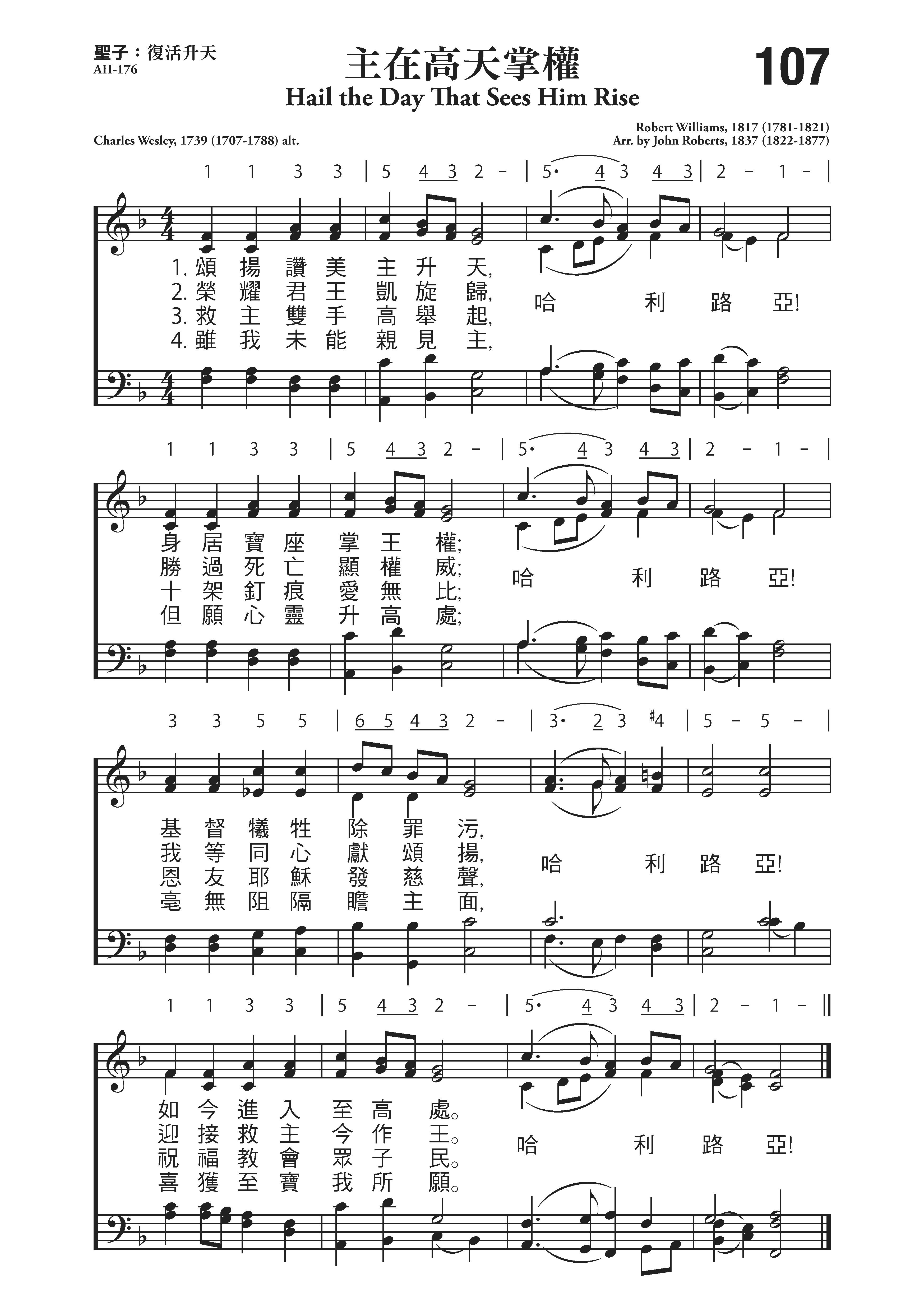 查理.卫斯理(Charles Wesley,1707,12,18-1788,3,29,见45首介绍)作词(1739年);罗伯特.威廉斯(Robert Williams ,约1781-1821,见11首介绍)作曲(1817年),约翰.罗伯茨(John Roberts,1822-1877)改编(1837年)