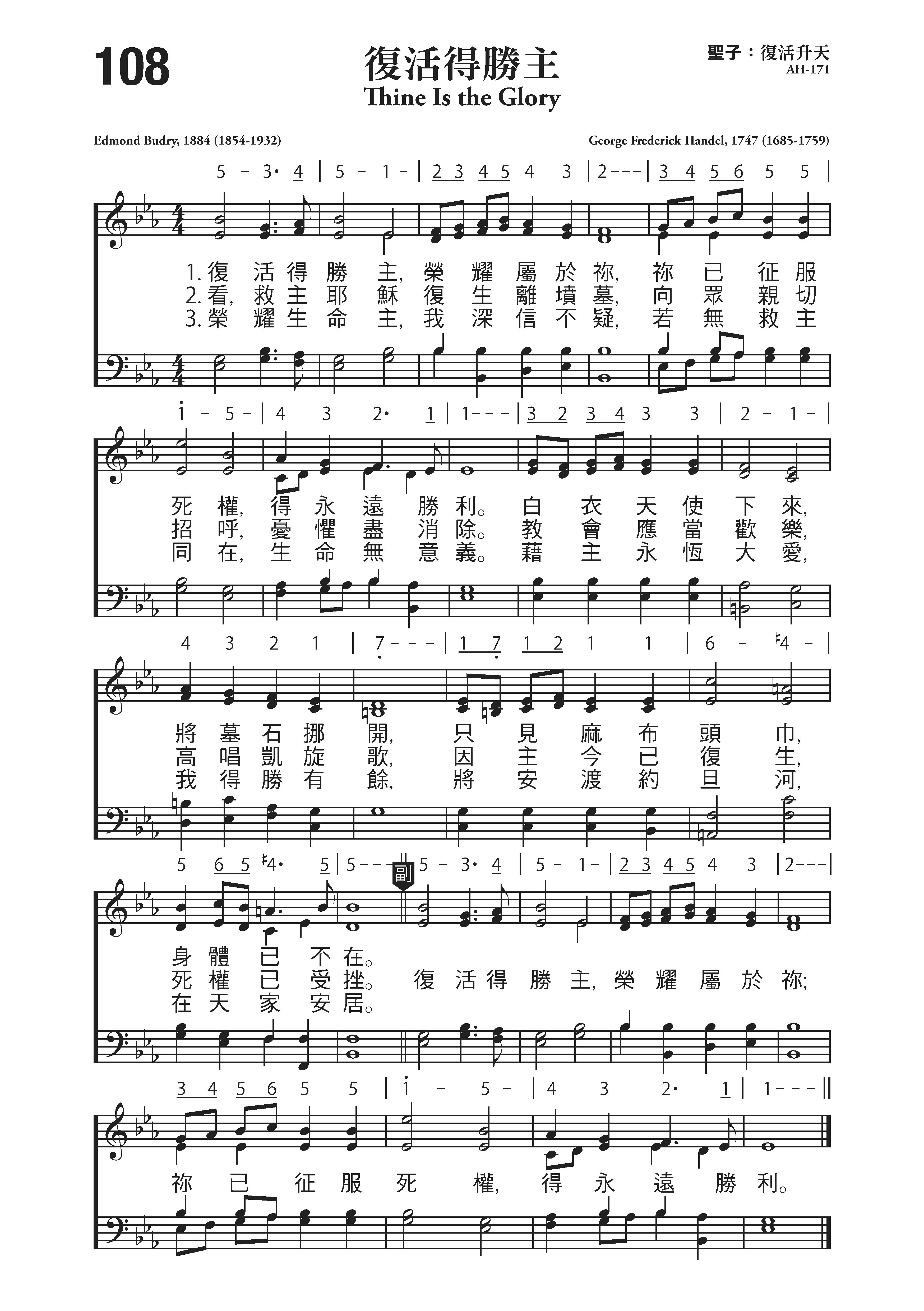 巴德里(Edmond L Budry,1854.8.30-1932.11.12)作词,霍伊尔(R.B.Hoyle,1875-1939)英译,曲调来自亨德尔(1685-1759,见第76首介绍)的清唱剧《犹大.马加比》