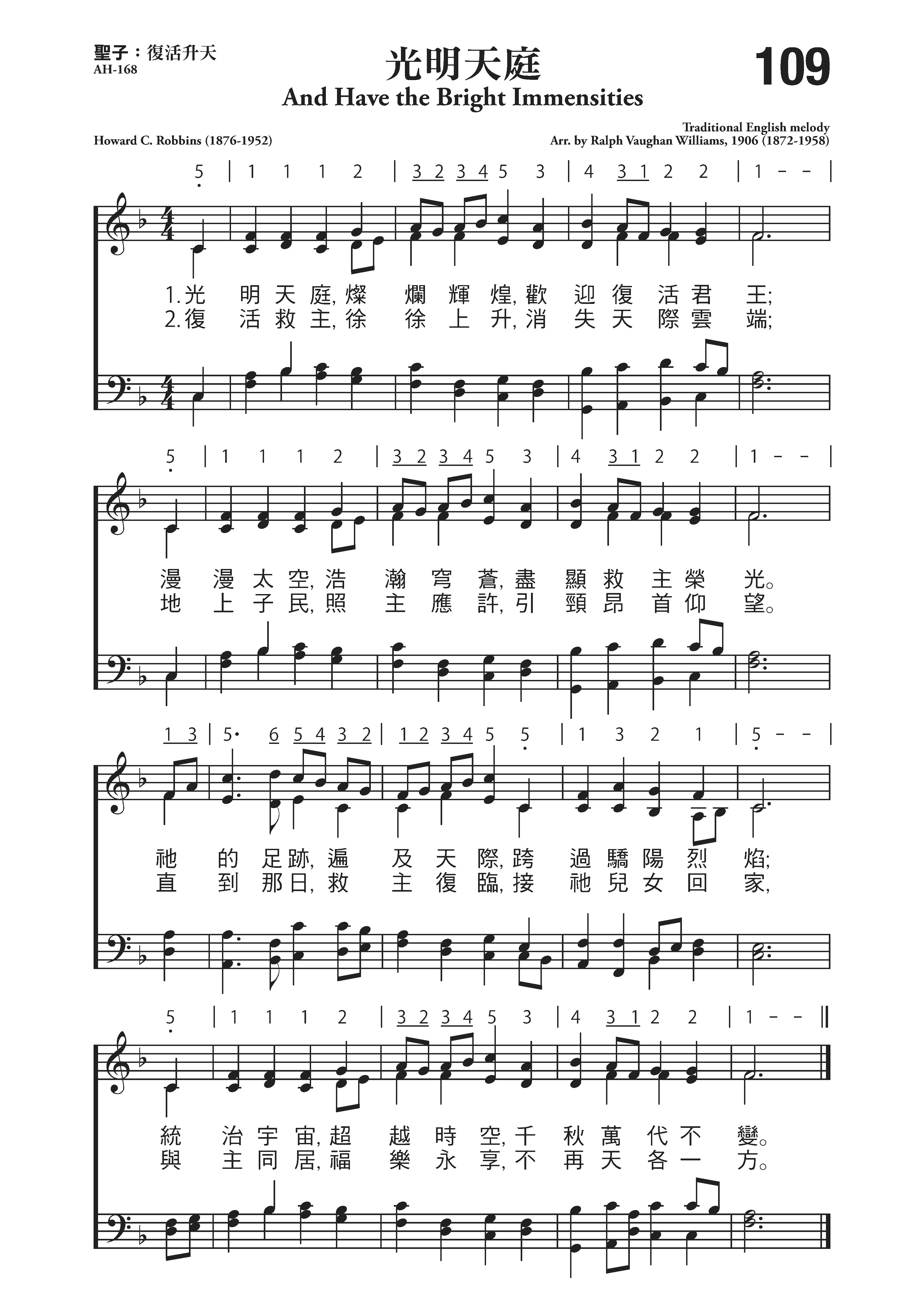 霍华德.罗宾斯(Howard Chander Robbins,1876-1952)作词;传统英国曲调,由威廉斯(Ralph Vaughan Williams,1872,10,12-1958,8,26,见22首介绍)配和声(1906年)